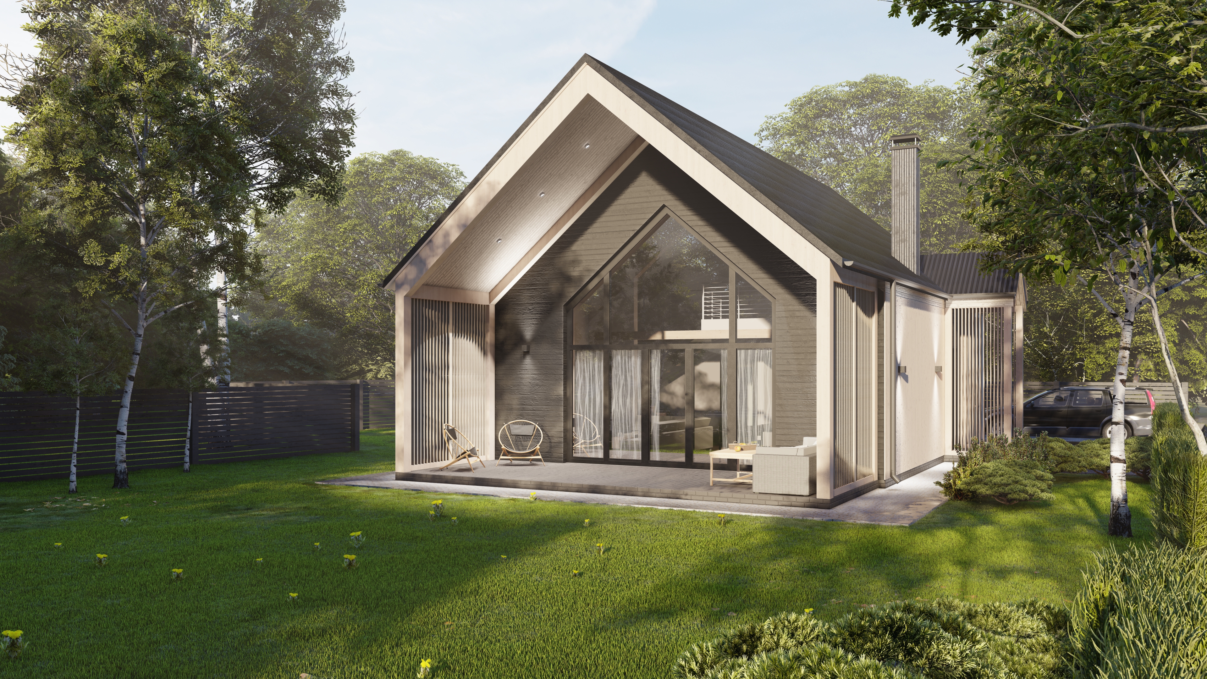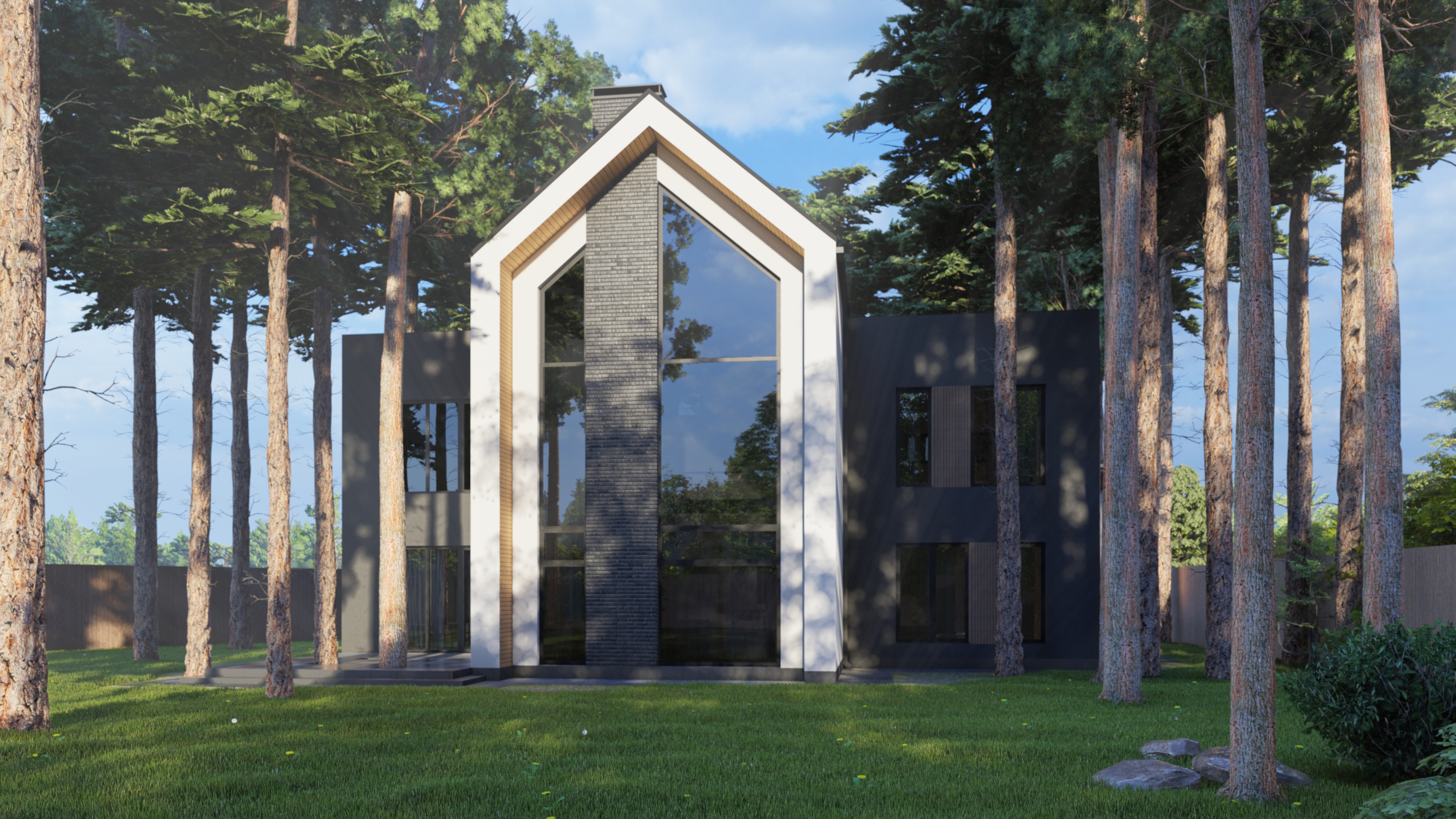 Каркасный одноэтажный дом. Выполнен в барнхаус. Фасады облицованы фиброцементными фасадными панелями в белых, графитовых и деревянных...