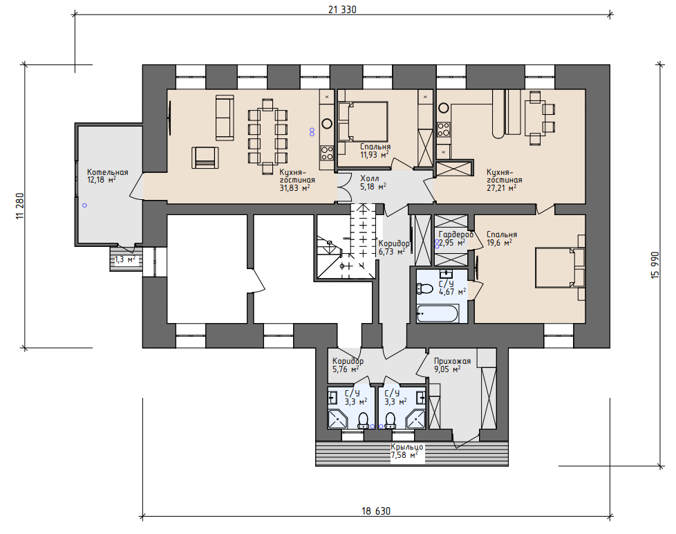 Двухэтажный дом из кирпича. Выполнен в сочетании стилей барнхаус и минимализм. Фасадное решение сочетает штукатурку и облицовочный...