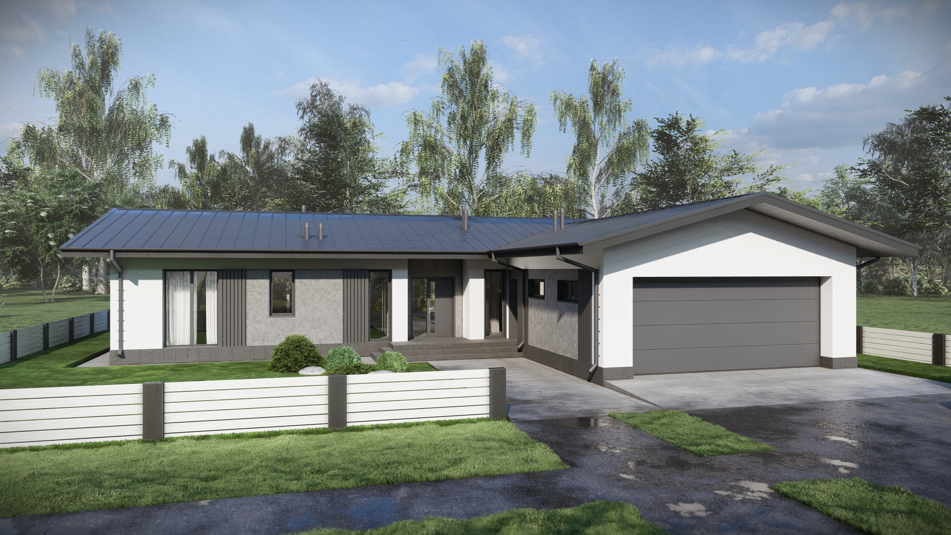 Одноэтажный дом из кирпича. Выполнен в современном стиле. В фасаде используется 2 метериала: белая и серая фасадная штукатурка и...