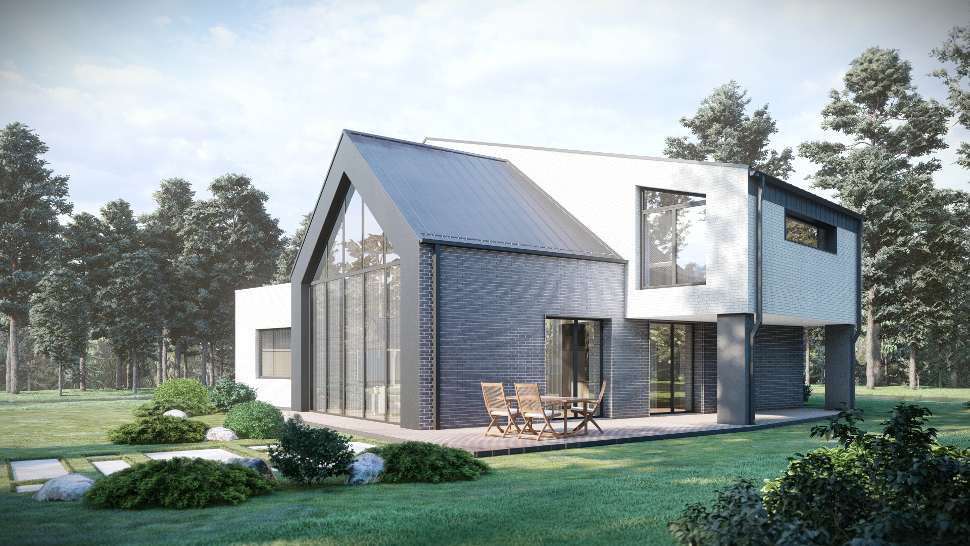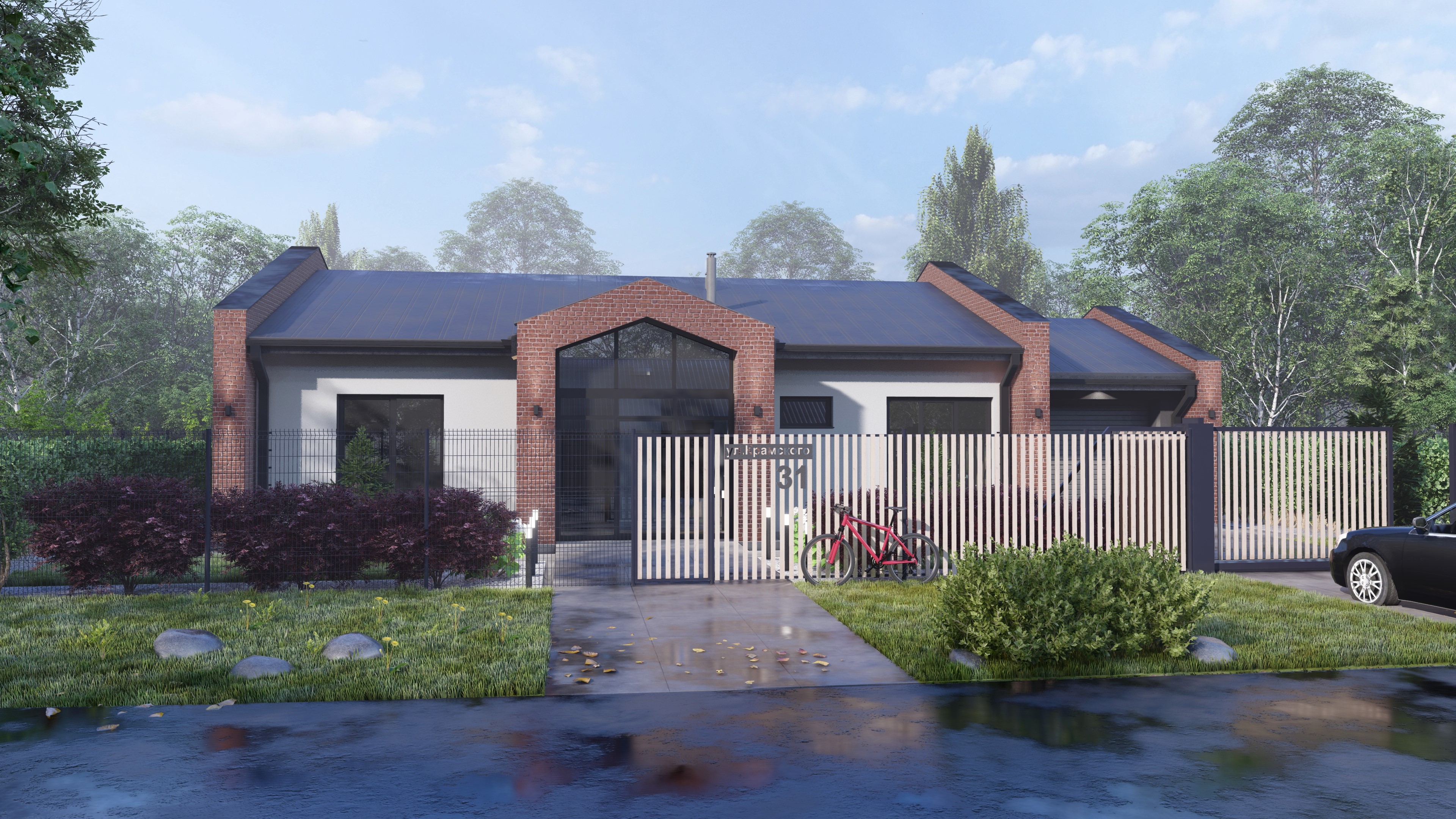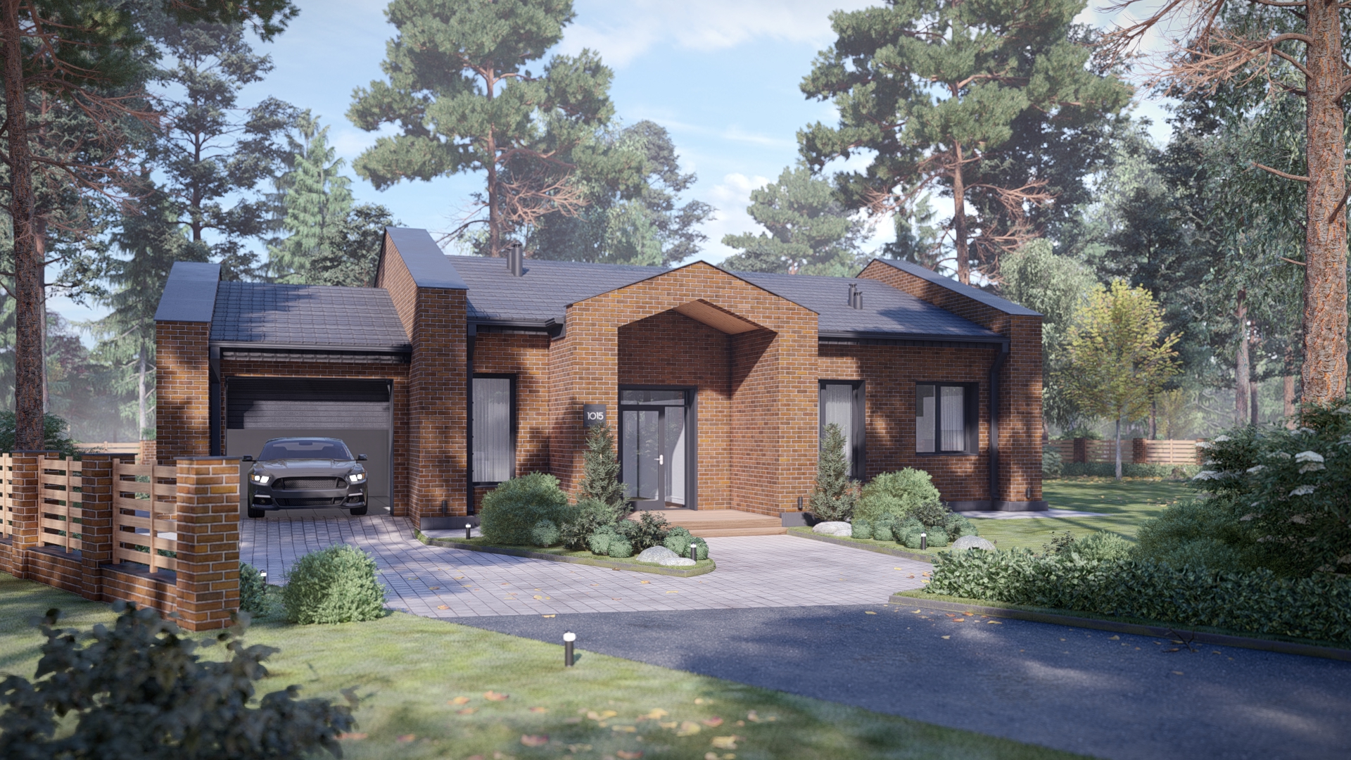 Одноэтажный индивидуальный жилой дом из кирпича в стиле лофт. Помещения дома: две спальни, кухня, столовая-гостиная, гараж для одного...