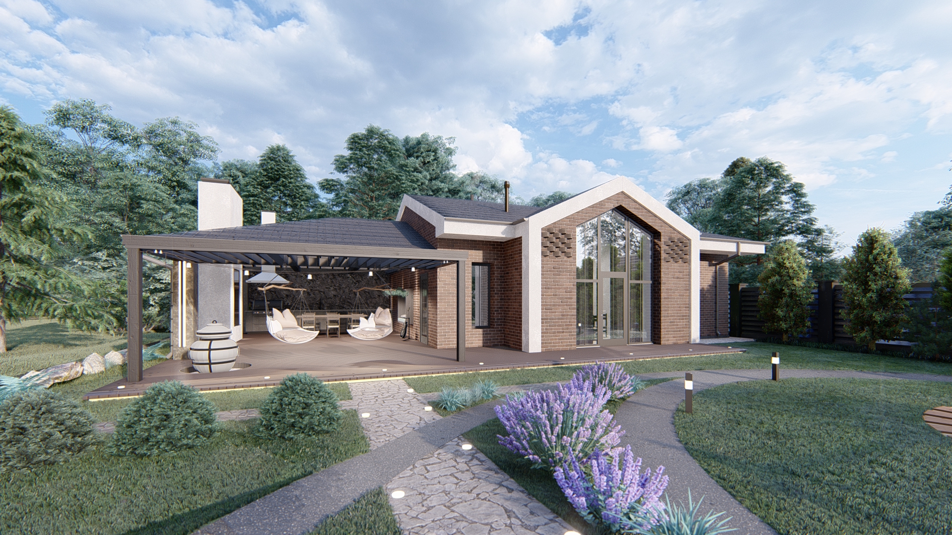 Одноэтажная летняя кухня с техническими помещениями из кирпича. Дом выполнен в смешанном стиле - минимализм, барнхаус. В фасаде...