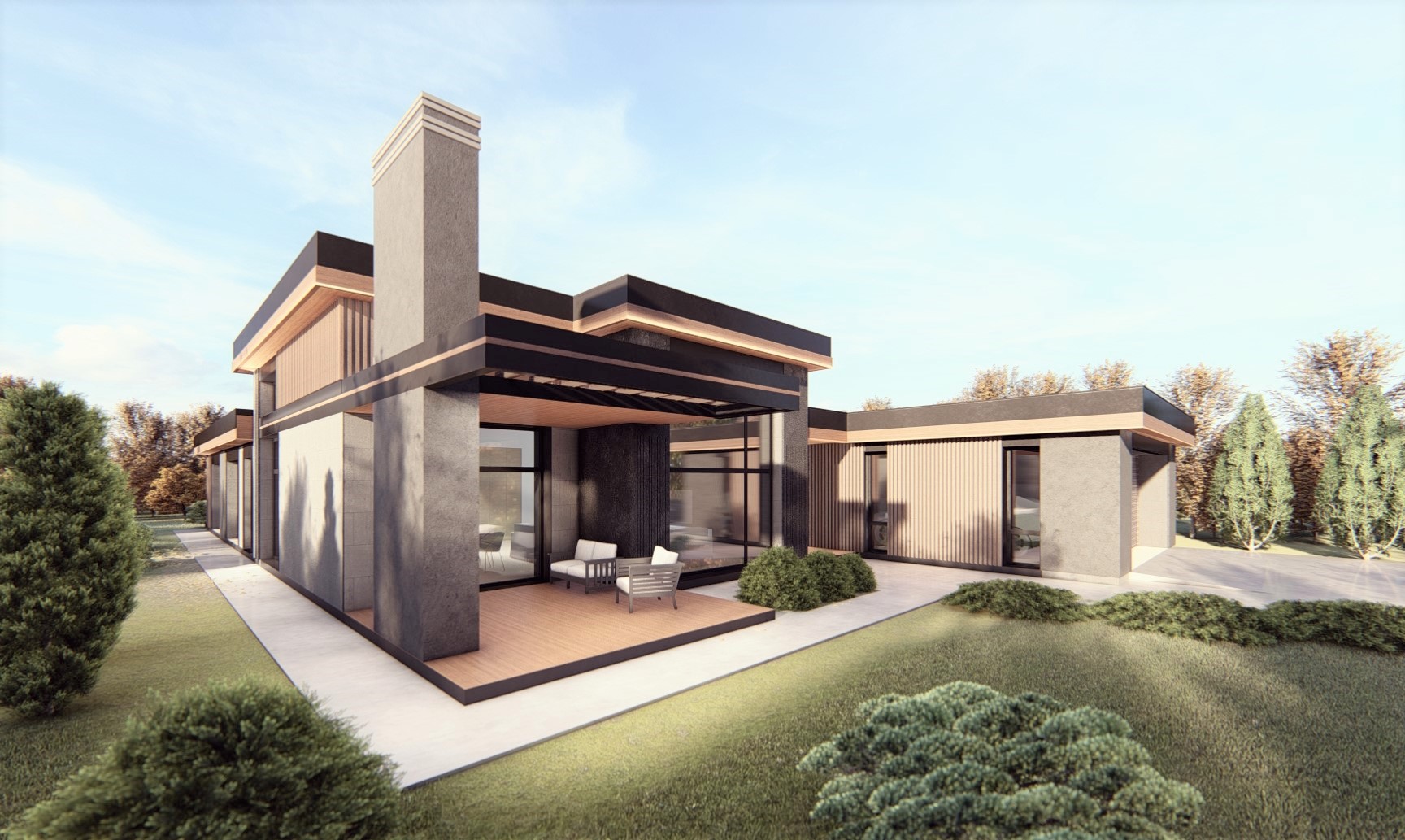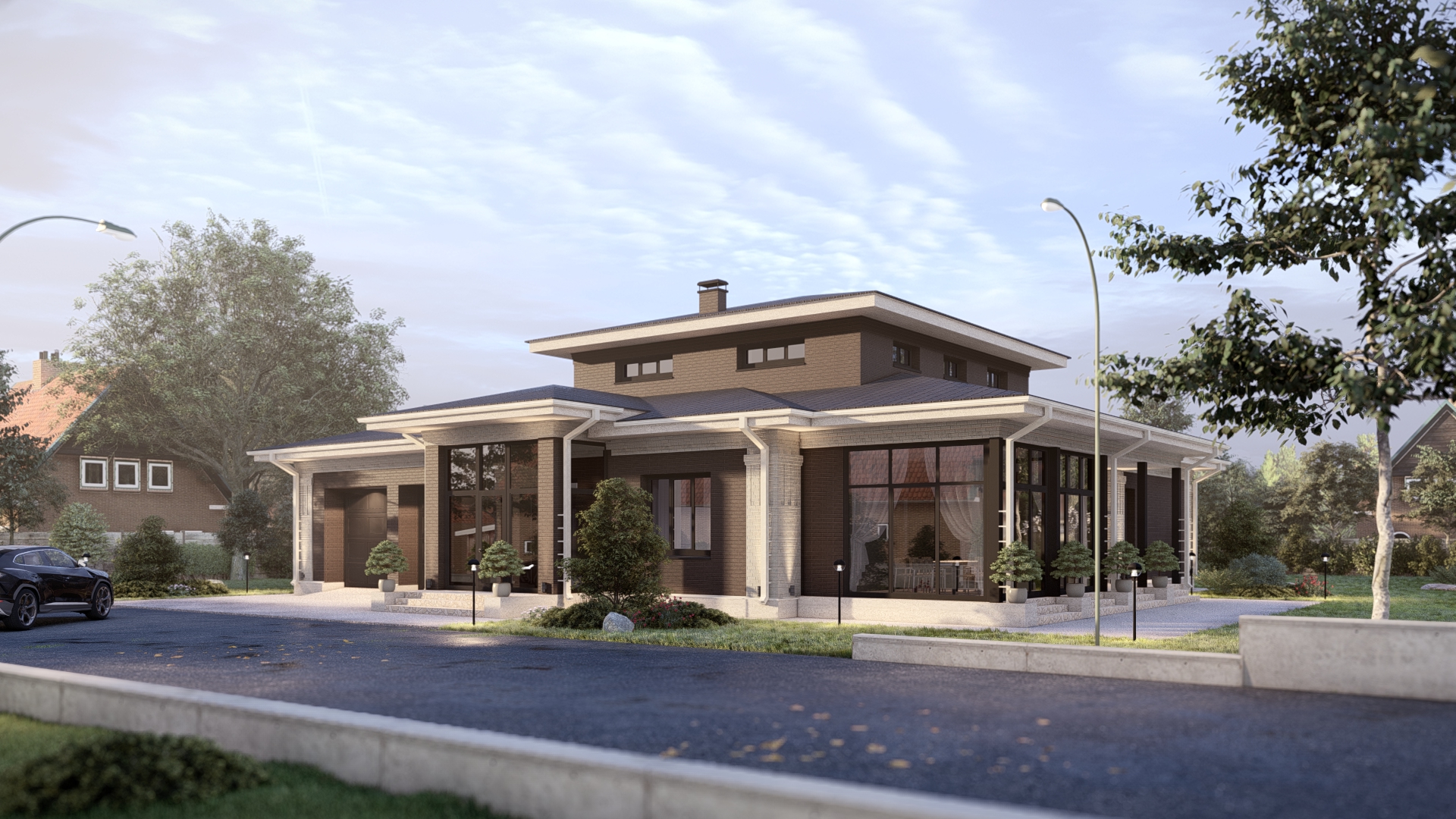Одноэтажный дом из кирпича в стиле «прерий». Помещения дома: тамбур, прихожая, кухня-столовая-гостиная, 3 санузла, кладовая, гардеробная, 4...