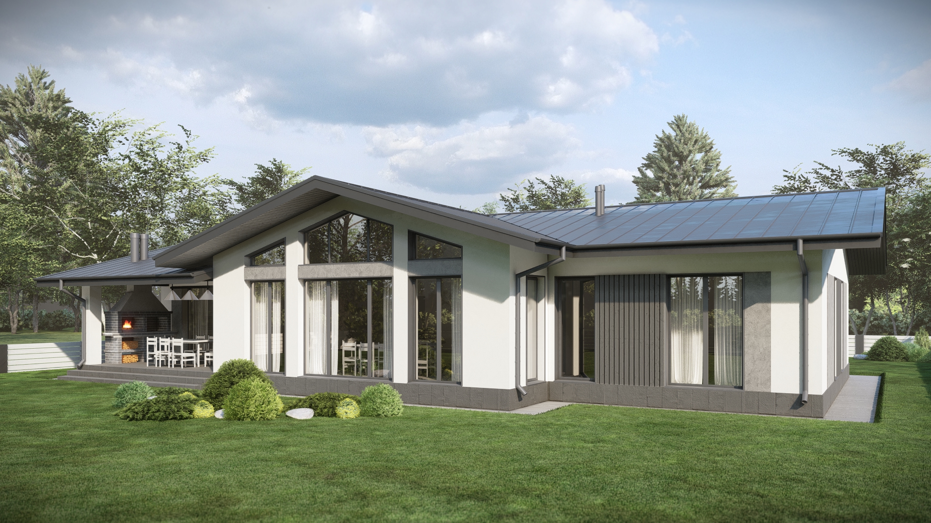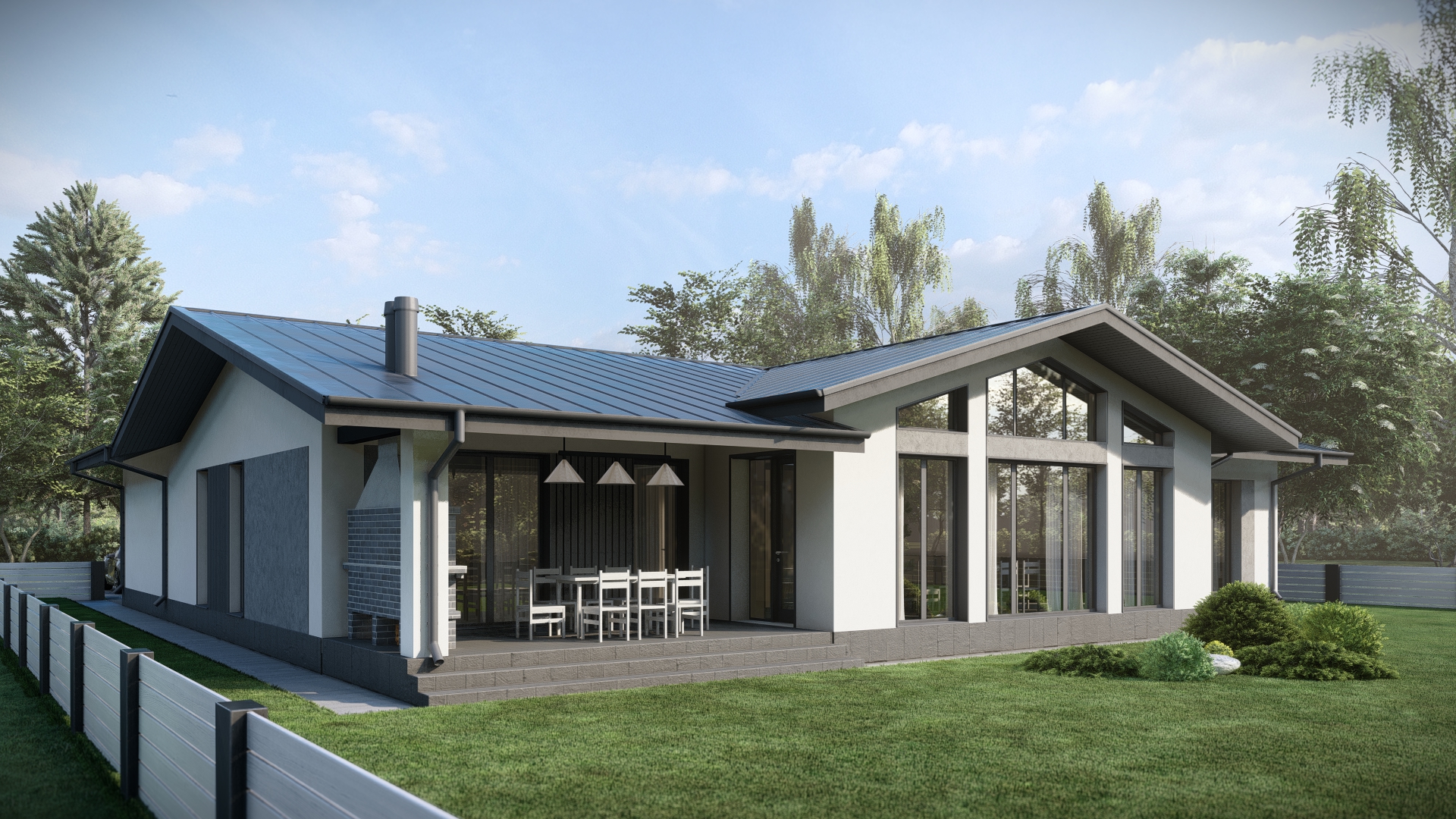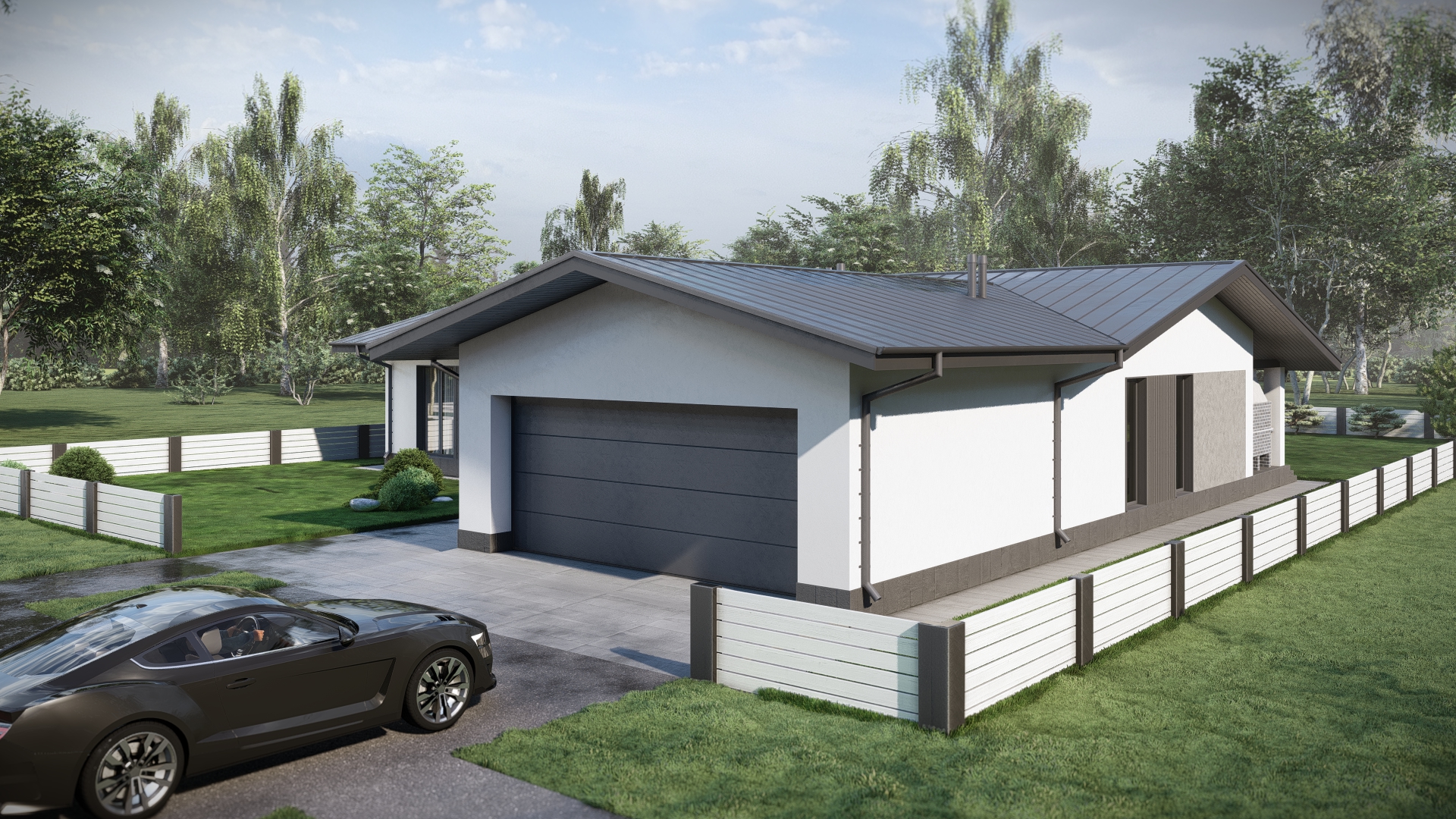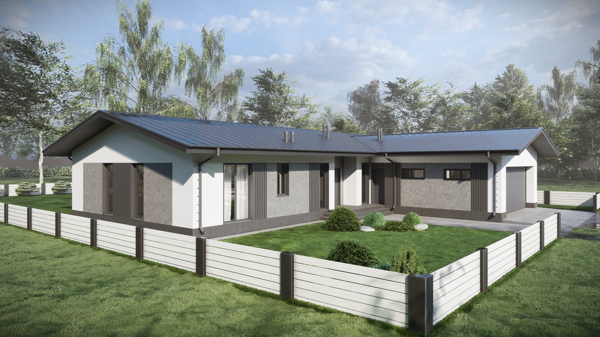 В фасаде используется 2 метериала: белая и серая фасадная штукатурка и планкен с покраской темно серым цветом.