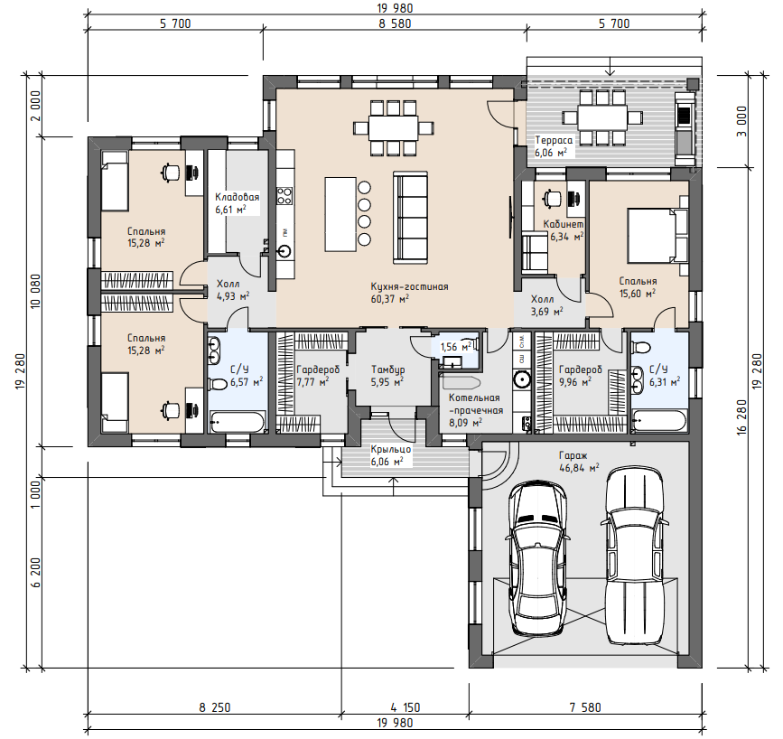 Помещения дома: тамбур, гардероб, котельная, холл, 3 сан.тех.узла, кухня-гостиная, кладовая, 3 спальные