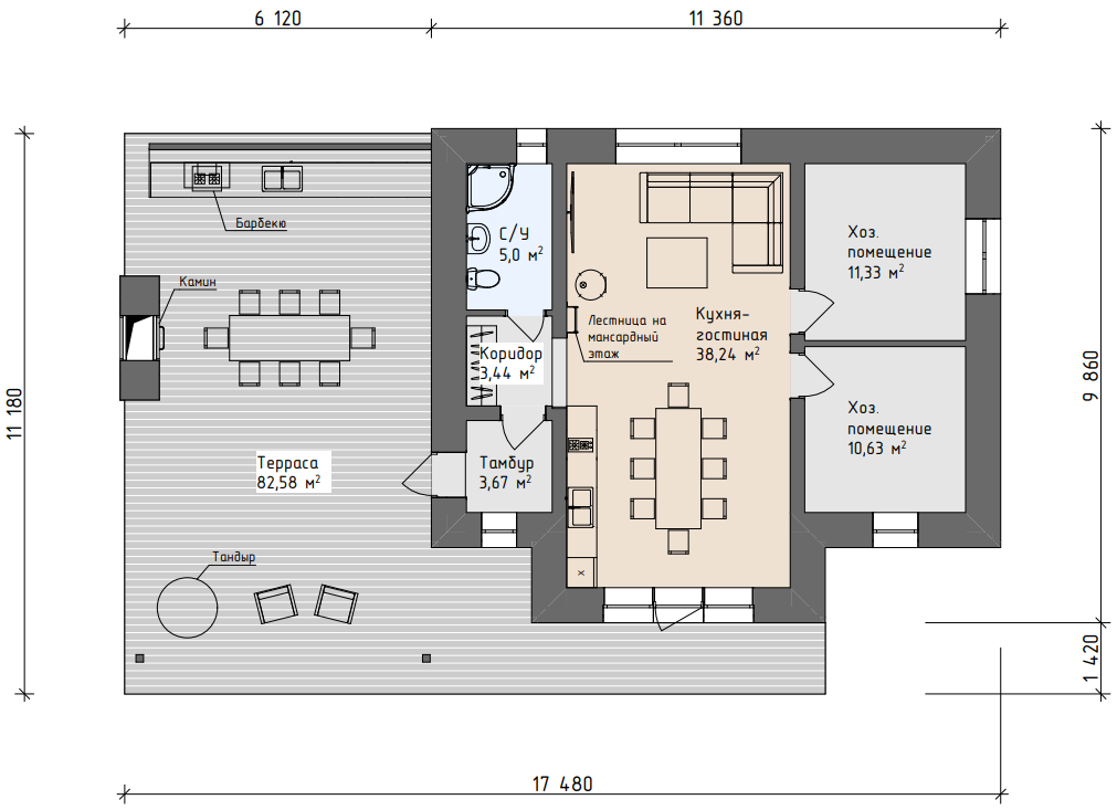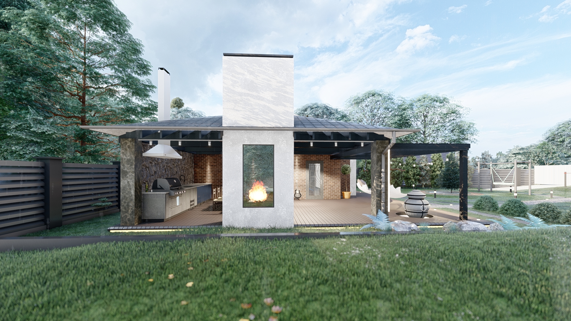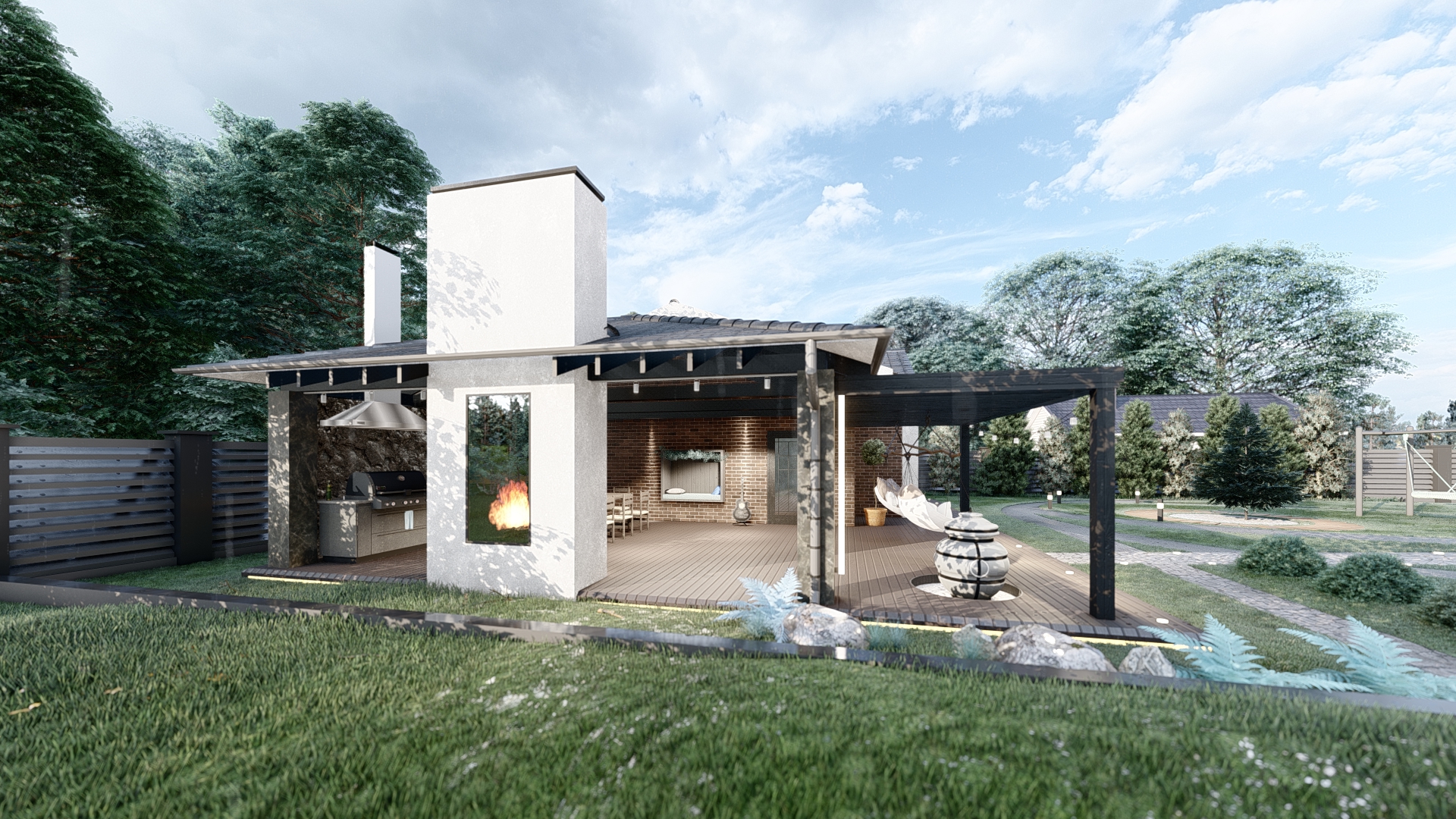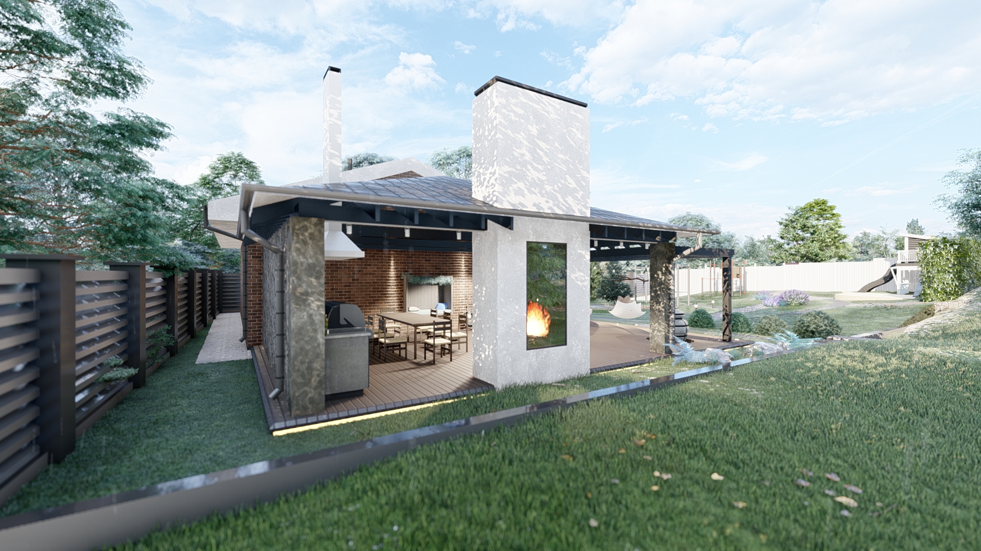 Одноэтажная летняя кухня с техническими помещениями из кирпича.