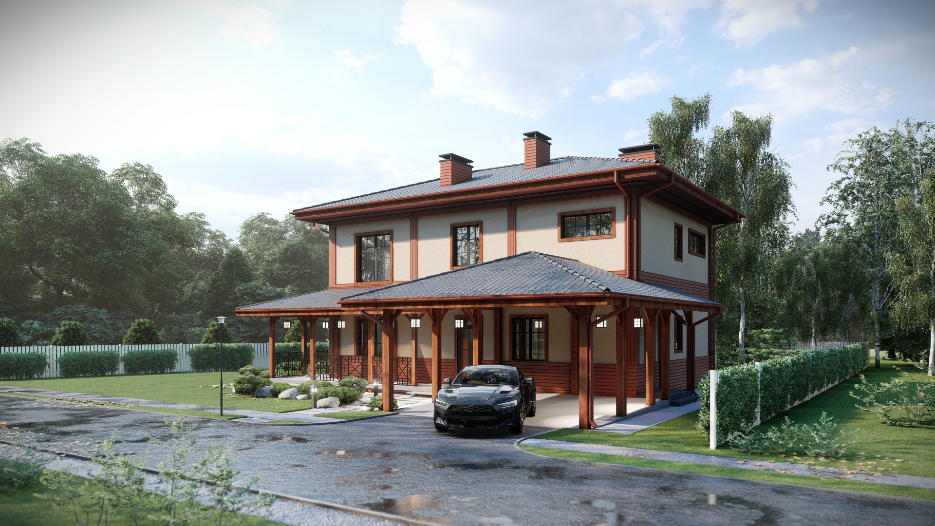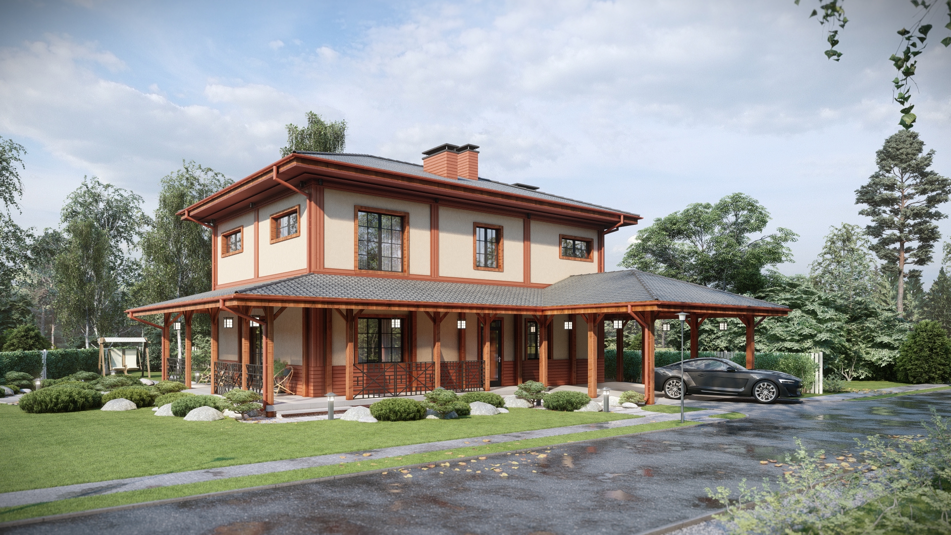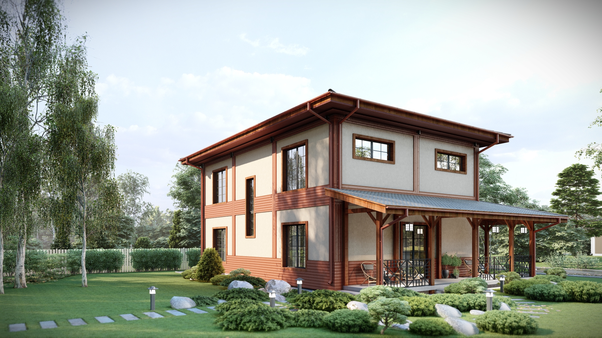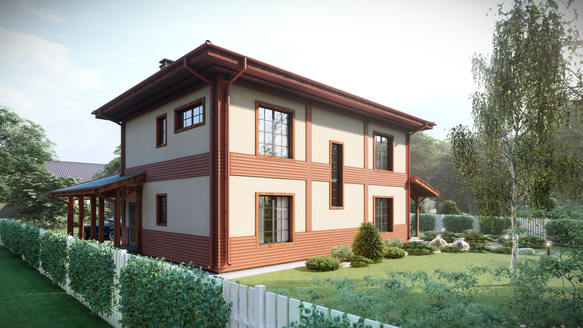 отделка фасада: фасадная штукатурка с декором из деревянного планкена