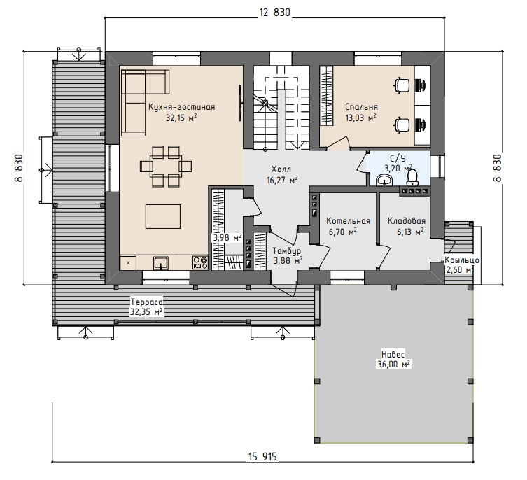 Планировочное решение: на первом этаже кухня-гостиная, кабинет,сан.узел. кладовая и котельная