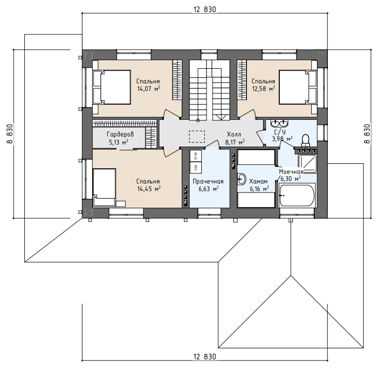 на втором этаже 3 спальни,2 сан.узла, хамам, прачечная