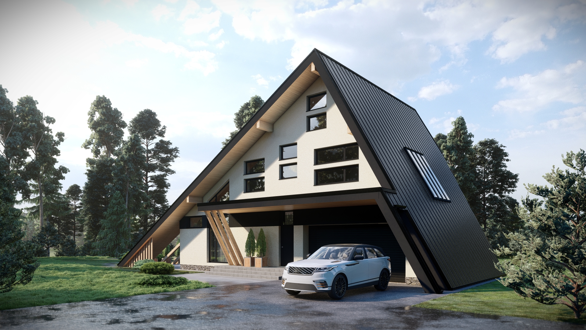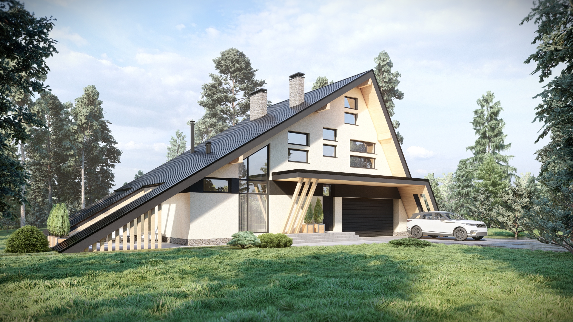 Дом выполнен в стиле эко-хижина. В отделке фасада используется бежевая штукатурка с серой полосой из навесного фасада и отделкой цоколя навесным фасадом под камень.