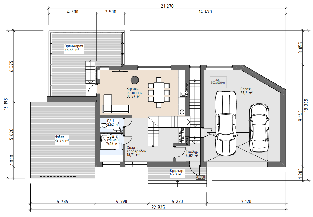 Помещения 1-го этажа: тамбур, холл с гардеробом, сан.тех.узел, душ с сауной, кухня-гостиная, гараж, оранжерея.