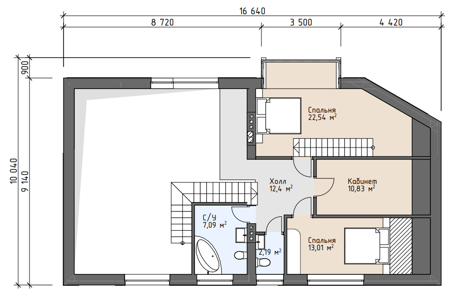 Помещения 2-го этажа: холл, сан.тех.узел, ванная комната, 2 спальные комнаты, кабинет.