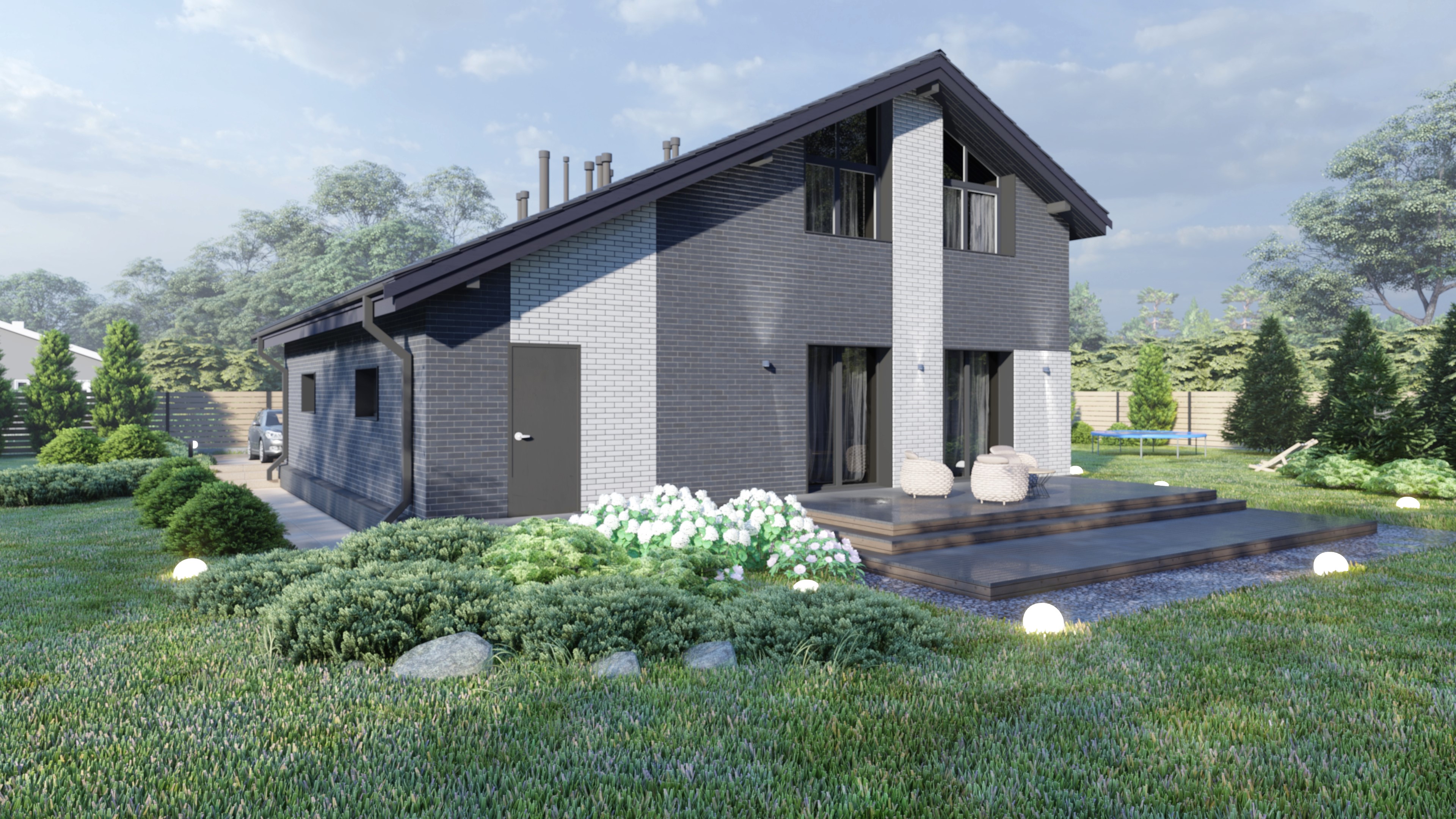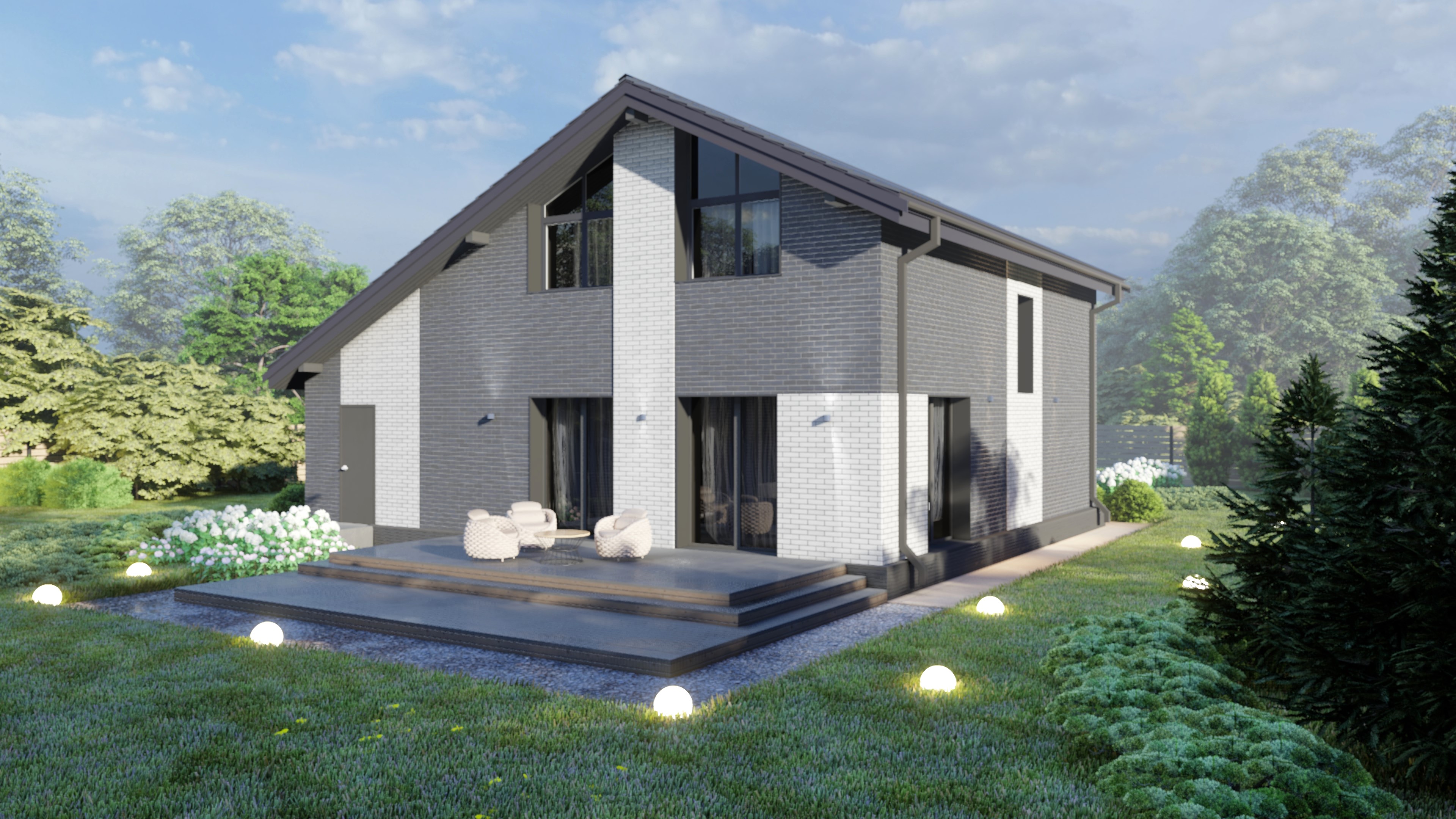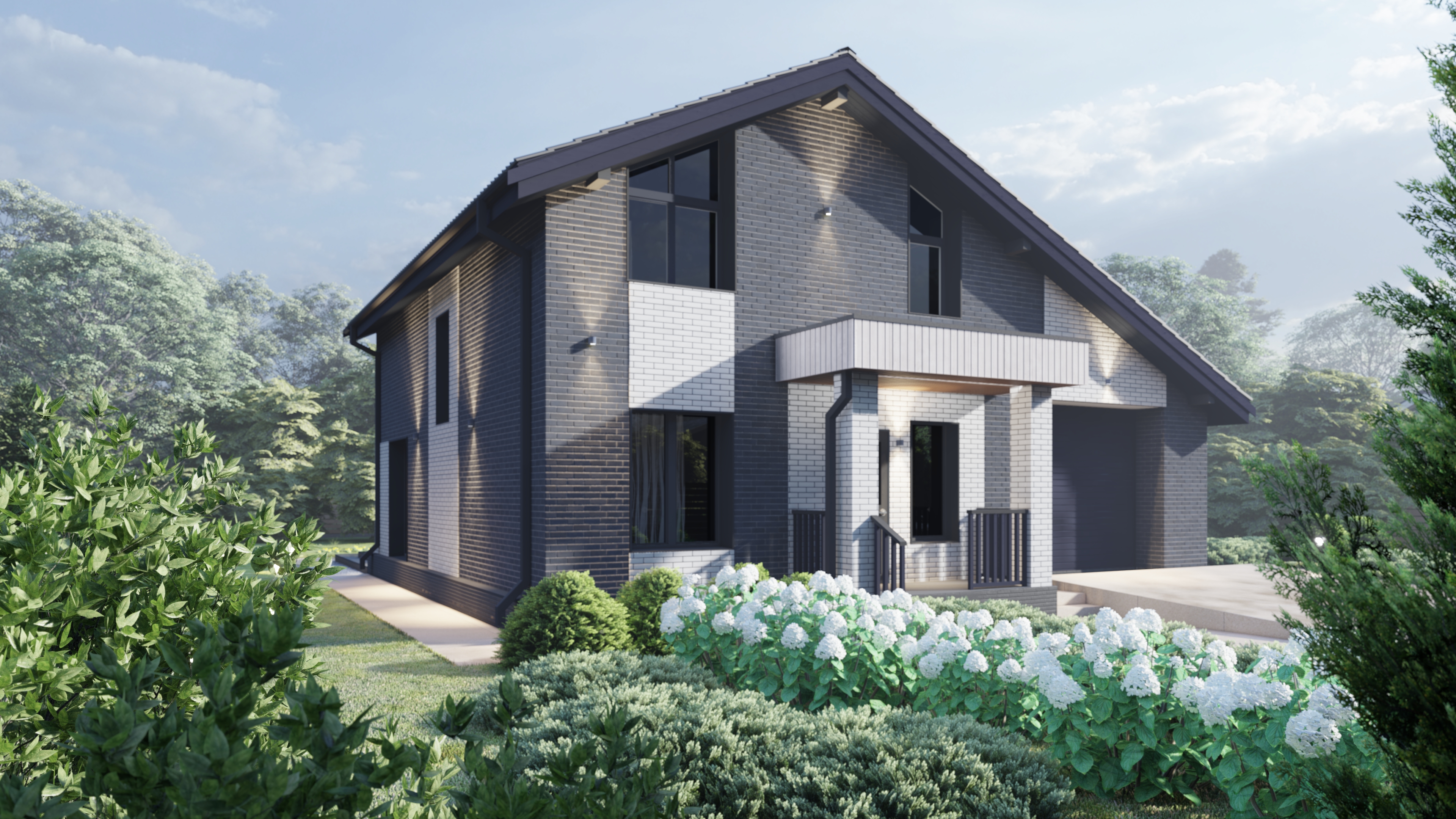 Одноэтажный с мансардой кирпичный дом. Отделка фасадов - облицовочный кирпич.