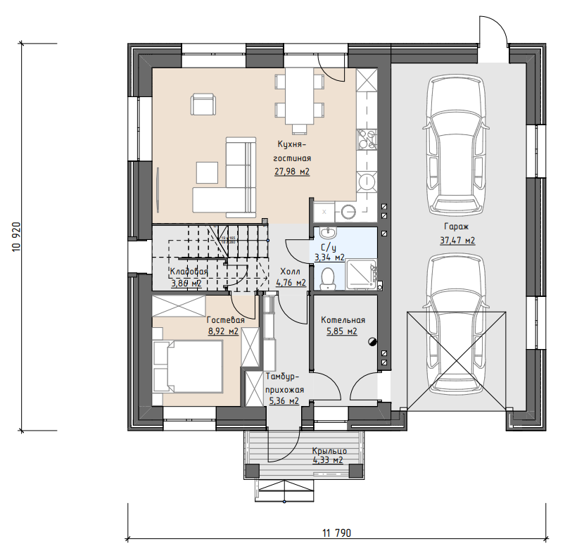 Помещения 1-го этажа: тамбур-прихожая, котельная, спальня, с/у, холл, кладовая, кухня-гостиная, гараж для 1 автомобиля.