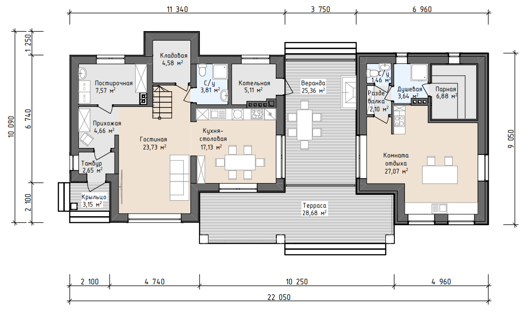 Помещения 1-го этажа дома: тамбур,холл, холл, прачечная, гостиная, кухня-столовая, кладовая, с/у, котельная, веранда.