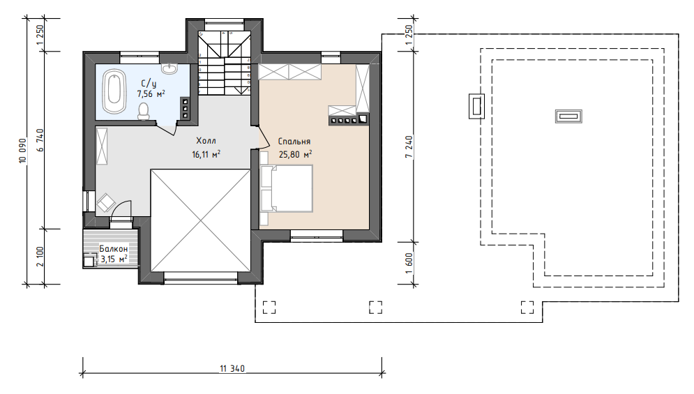 Помещения второго этажа: холл, спальня с гардеробом, с/у.