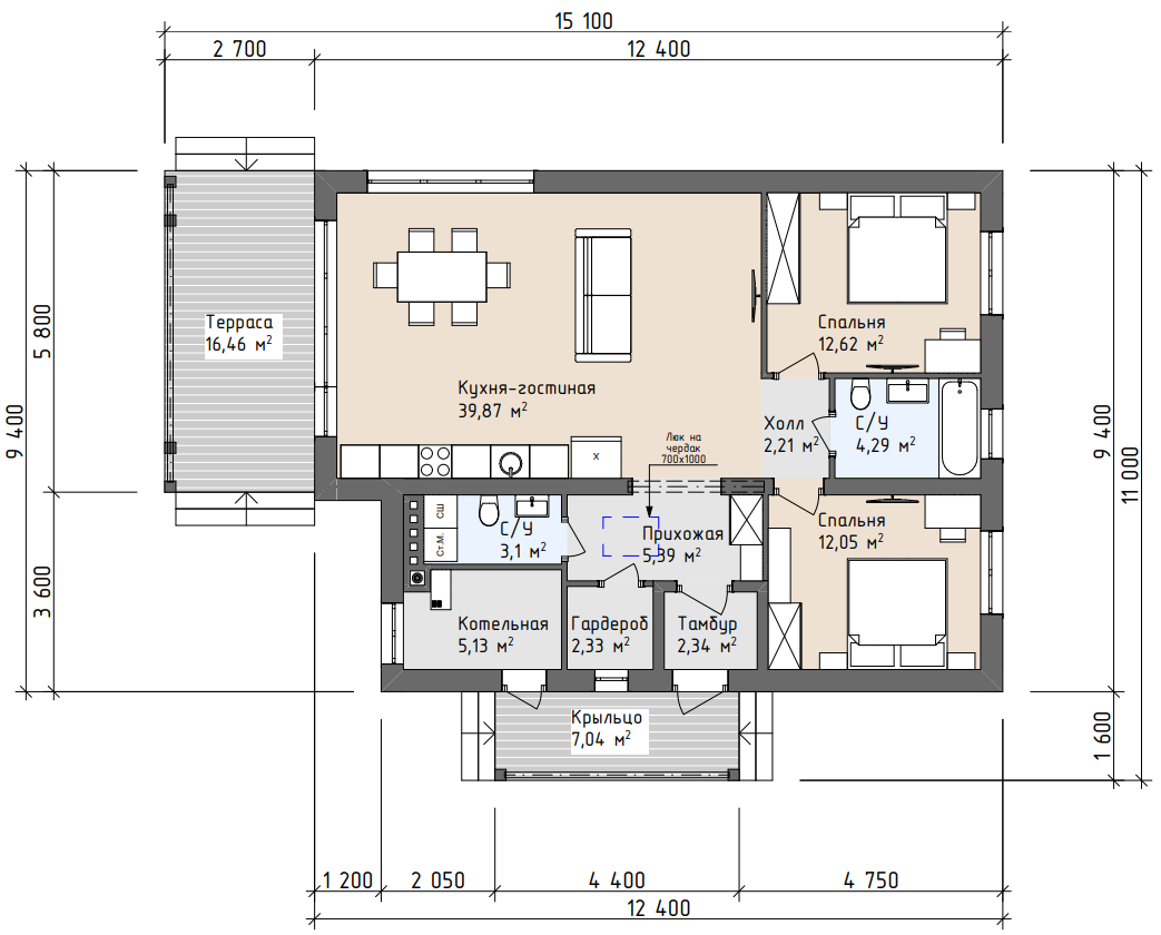 Площадь дома с крыльцом и террасой: 112,83 м2.