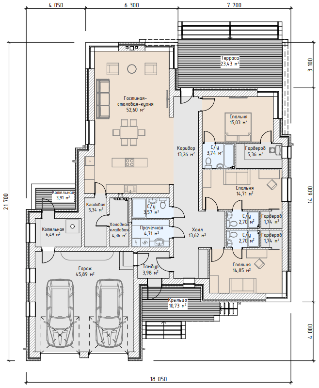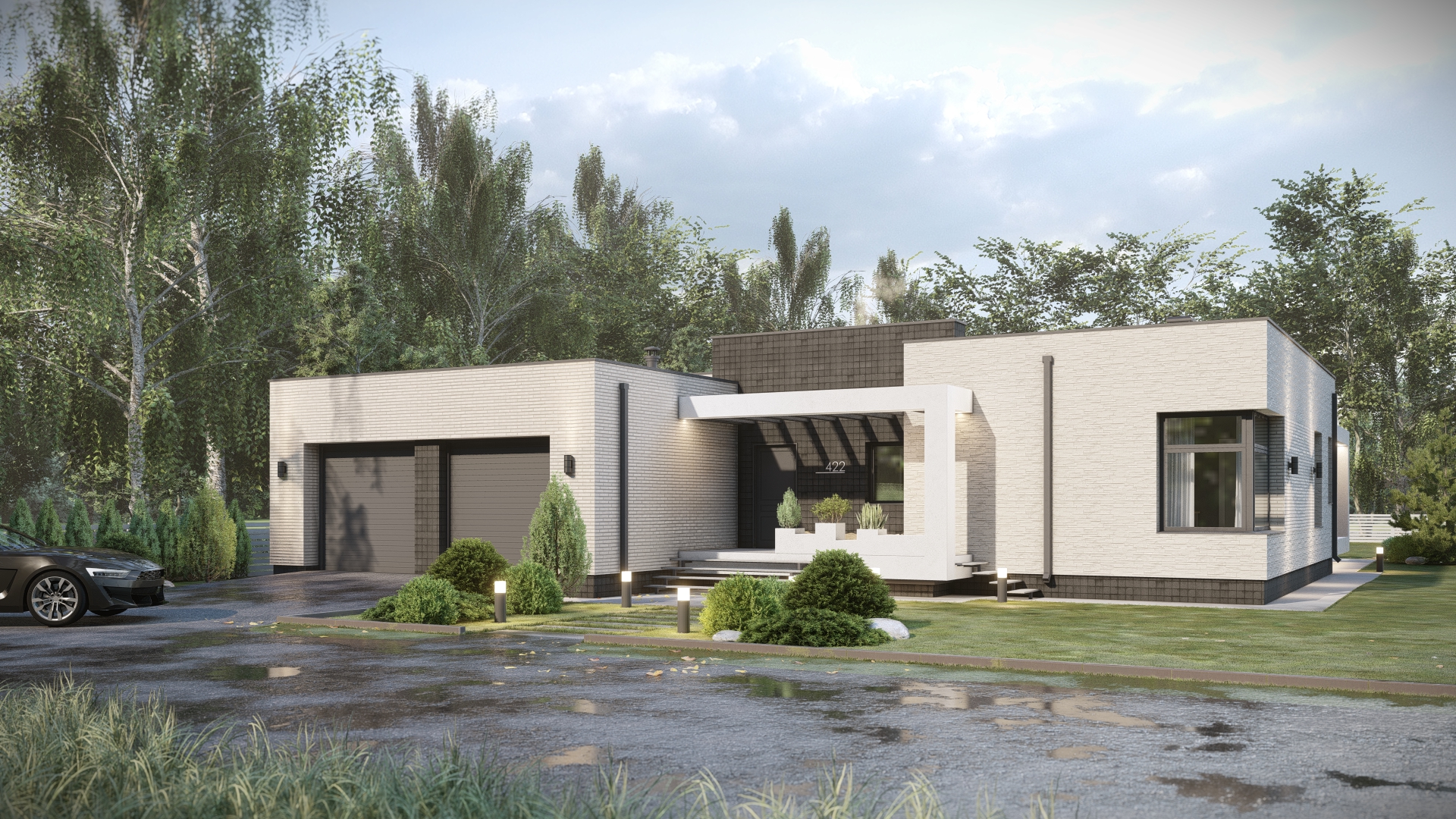 Дом из сибита, 1 этаж, полощадь 216,67 м2, 3 спальни, кухня-гостиная, котельная, гараж на 2 машин. В отделке фасада использованны навесные панели разных фактур, но единого тона, для более активного выделения архитектурных обьемов.