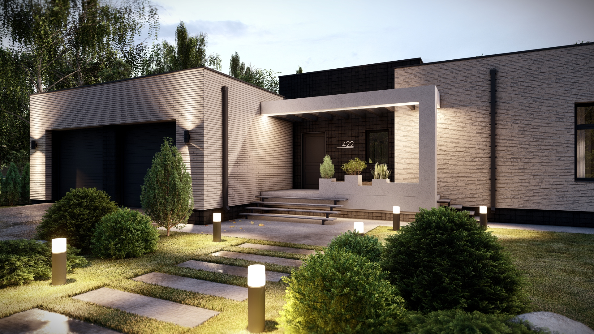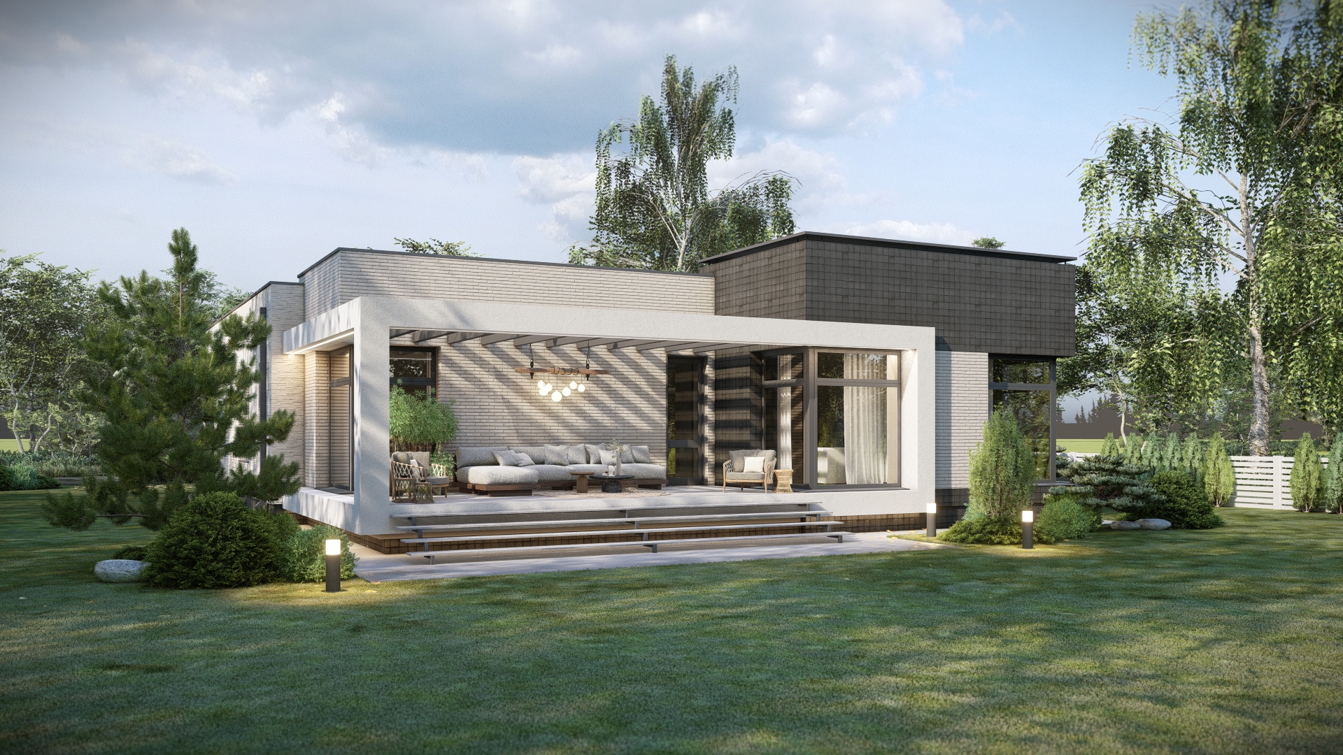 Клиенту нужен был 1 этажный дом, с внушительным набором помещений, при компактном участке, в стиле минимализм. При проектировании смогли удобно разместить все помещения и соблюсти заявленную стилистику, клиет и его дети остались довольны, т.к в каждой спальне был предусмотрен свой сан узел и гардероб
