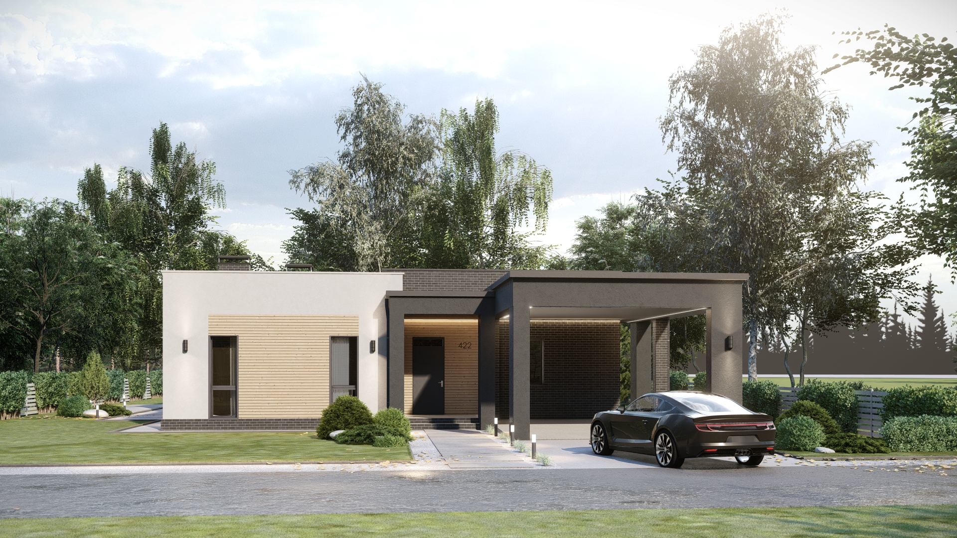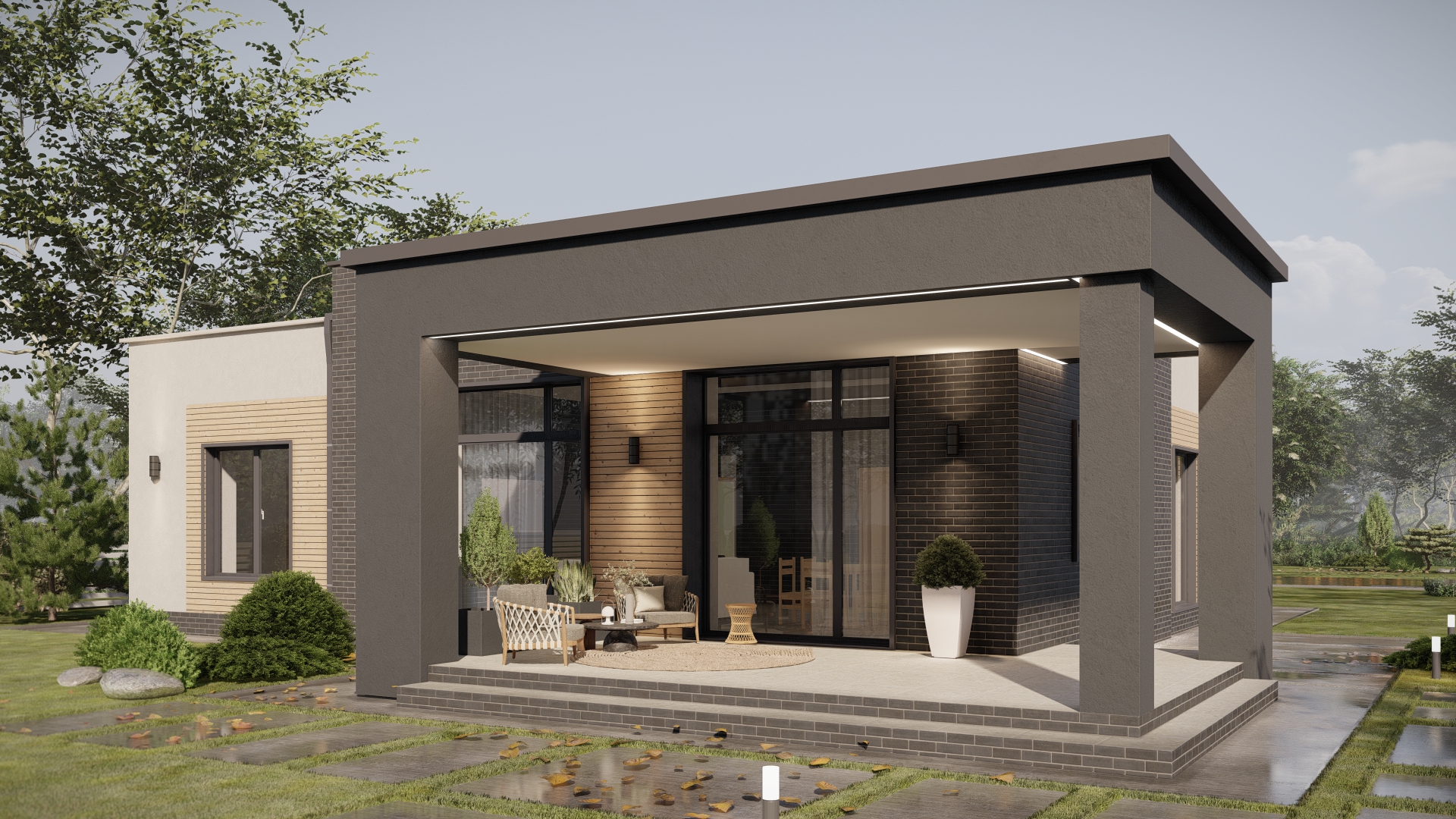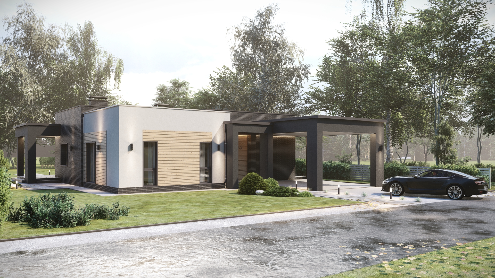 Одноэтажный индивидуальный жилой дом из кирпича в стиле минимализм.