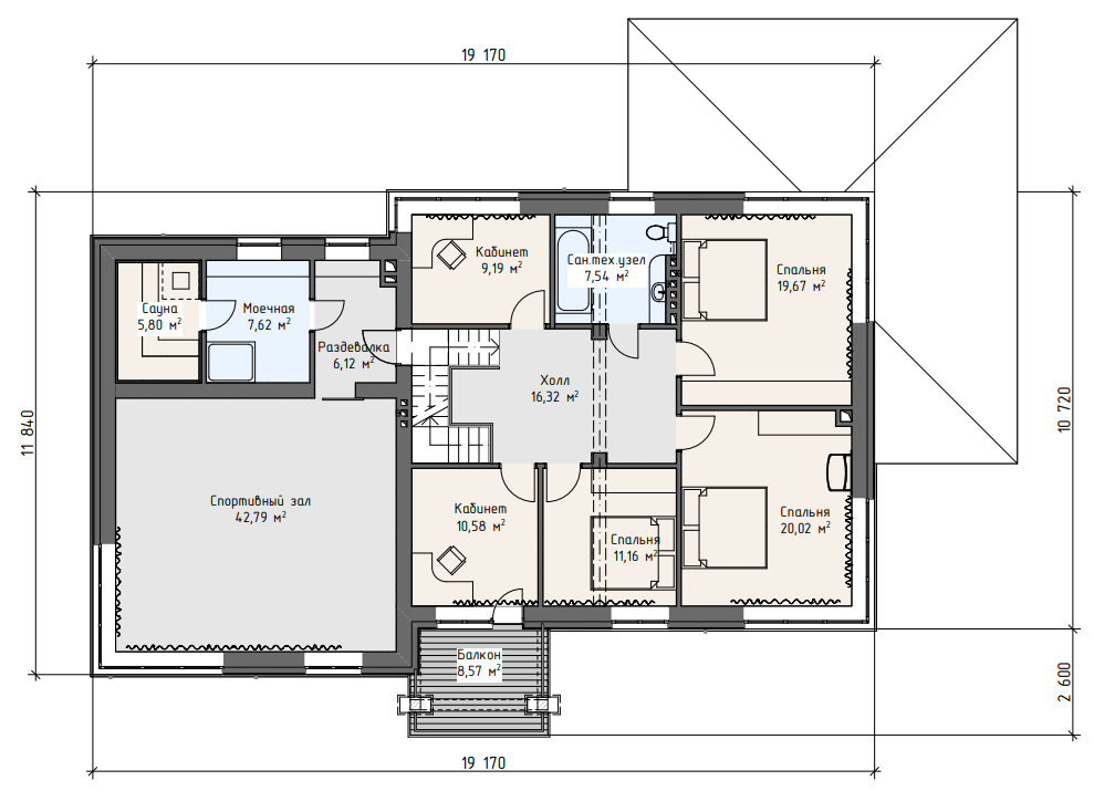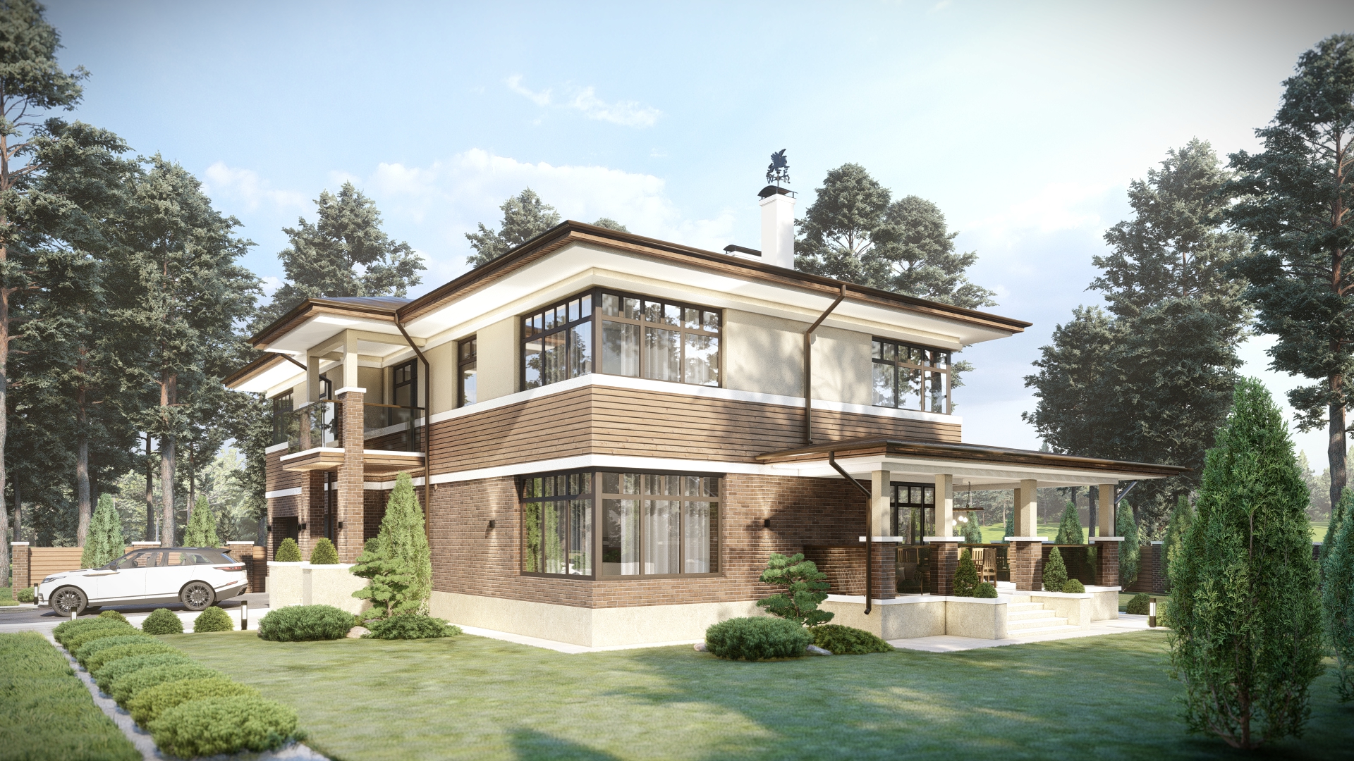 Дом проектировался под семью из 6 человек, не только для проживания, но и как место для работы хозяев дома, для этого в доме 2 кабинета, спортивно оздоровительная зона с сауной и спорт залом, а так же на первом этаже разделены кухня и гостиная, т к в гостиной будет отдельная отмосфера музыкального зала и релакса перед камином.