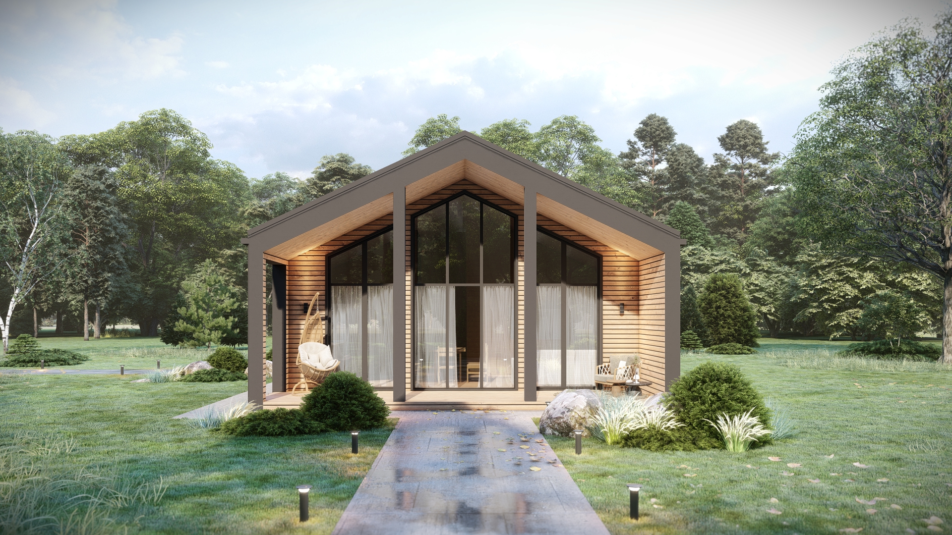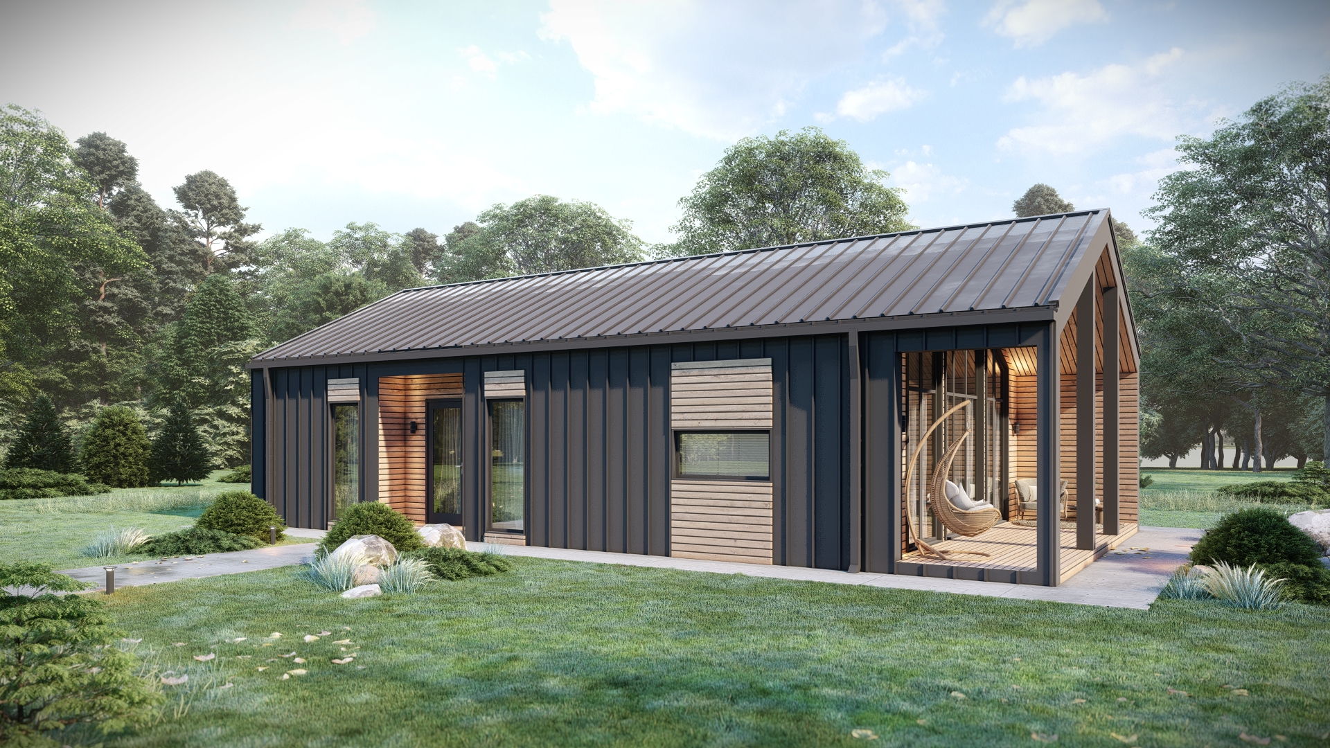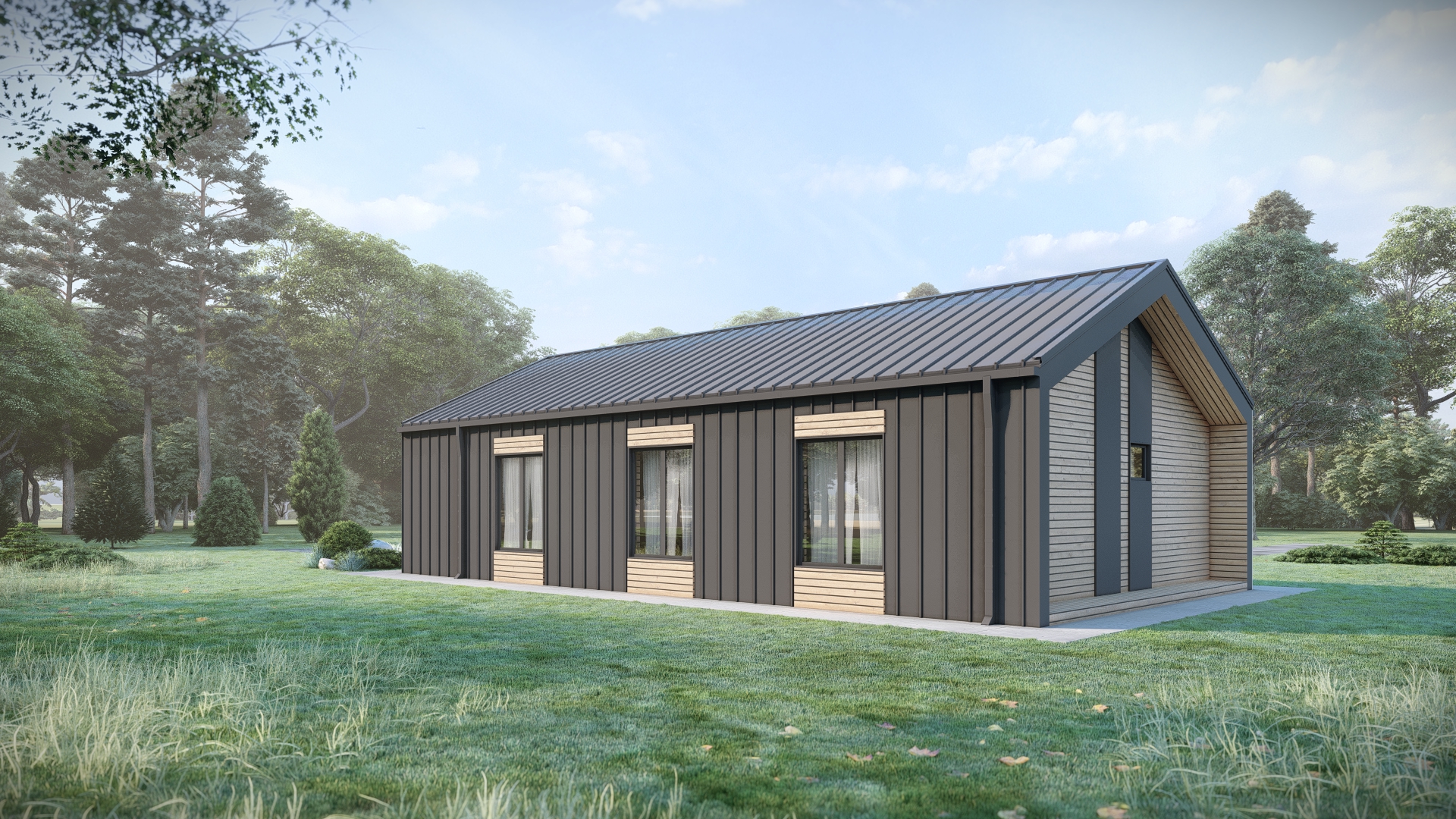 Одноэтажный дом из деревянного каркаса. Выполнен в стиле барнхаус.