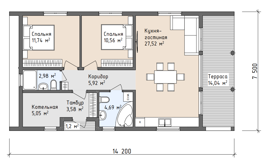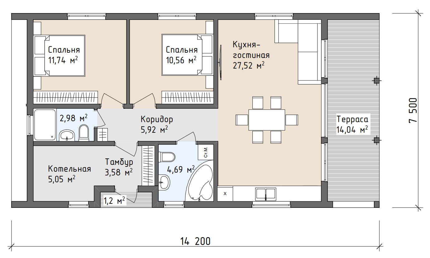 Помещения дома: тамбур, холл, два С/У, кухня-гостиная, котельная, две спальни.