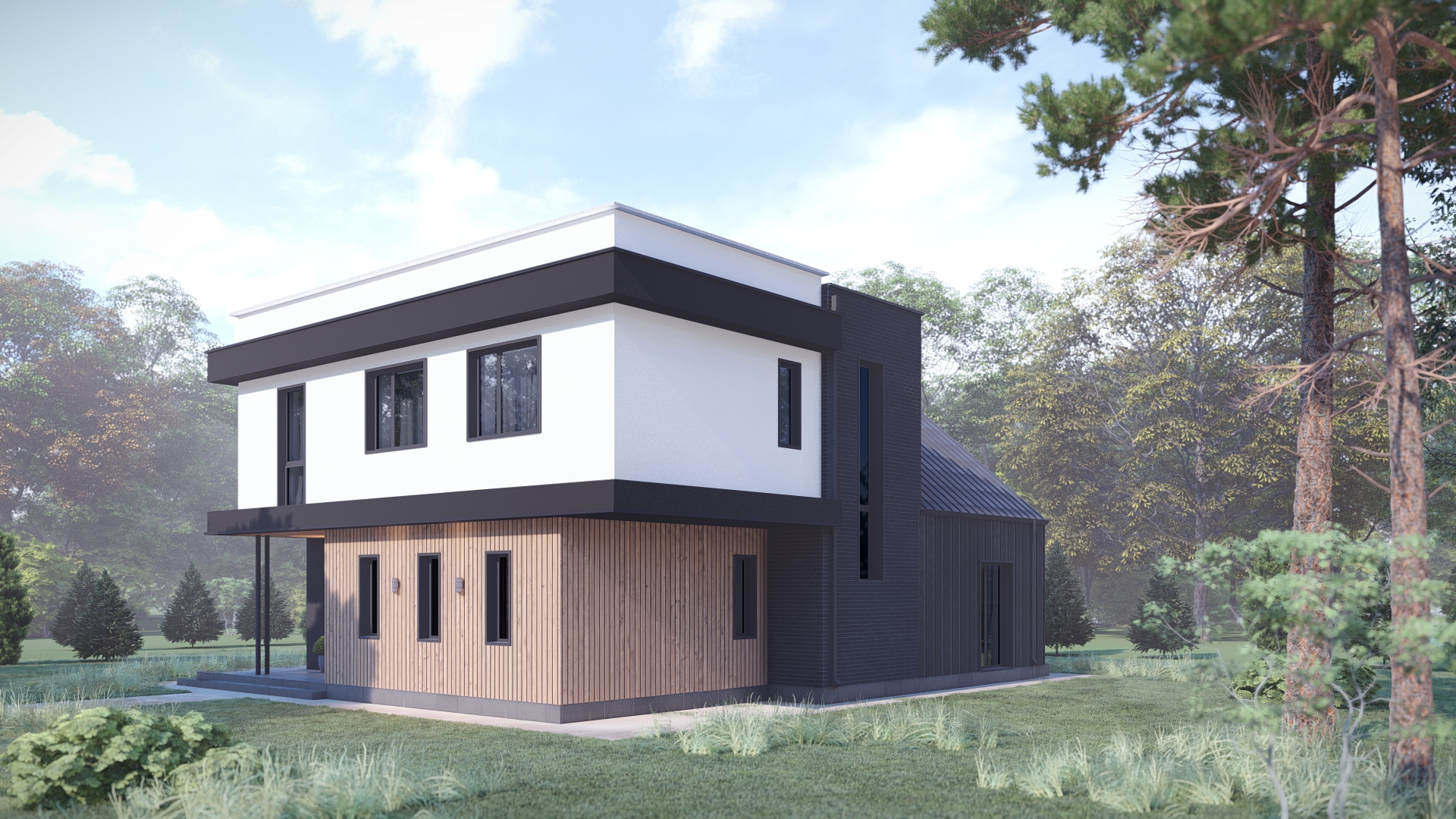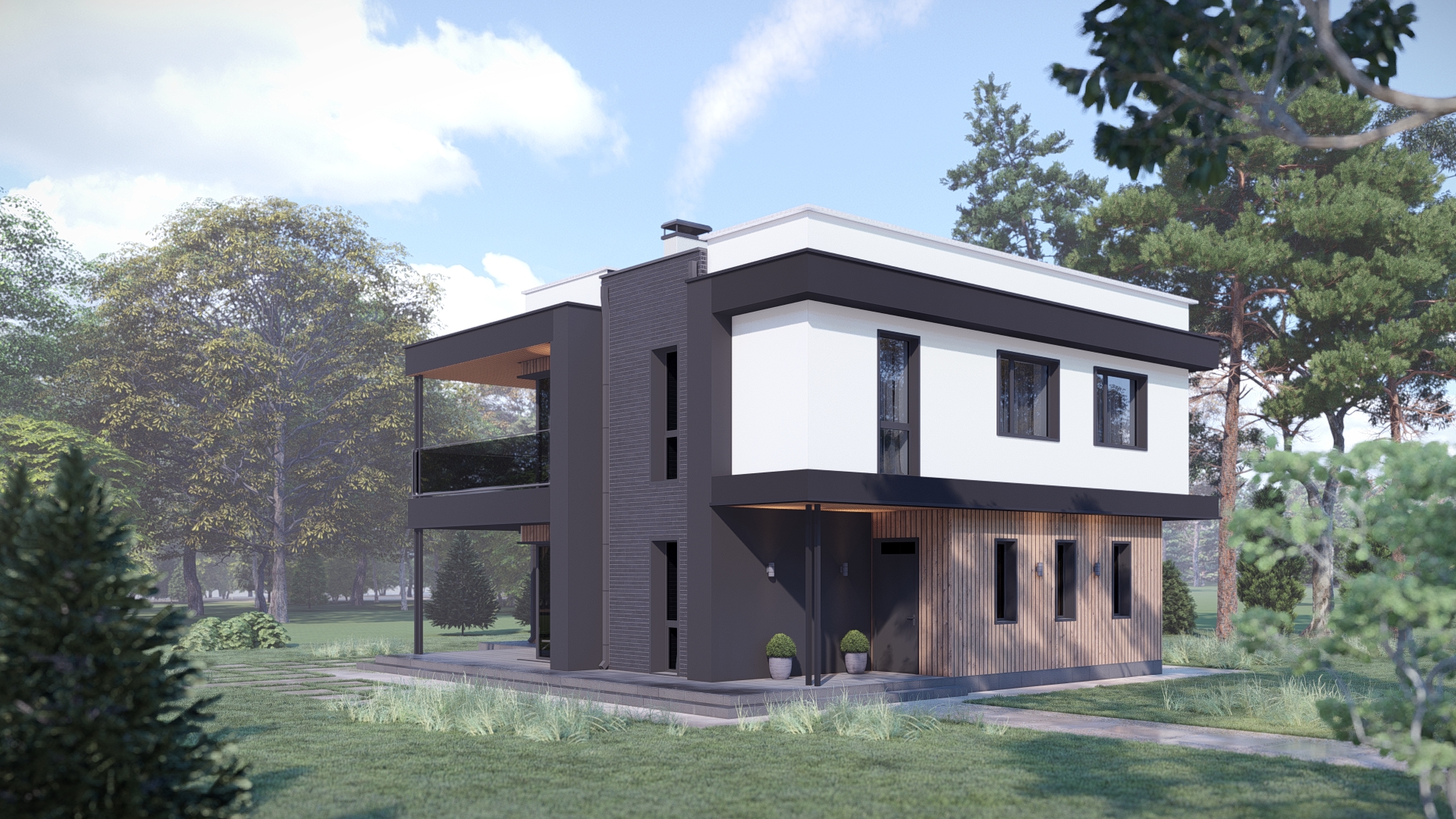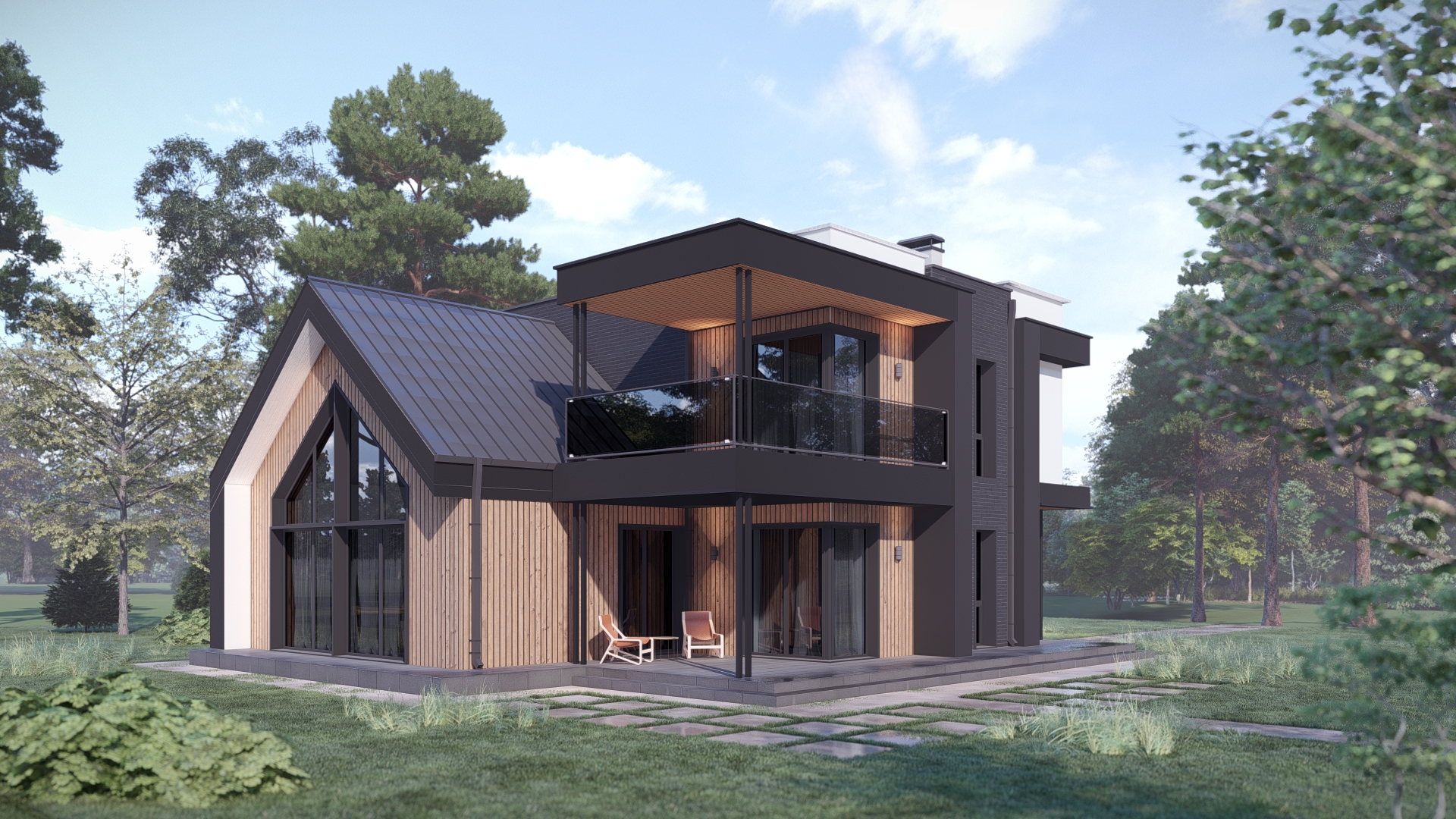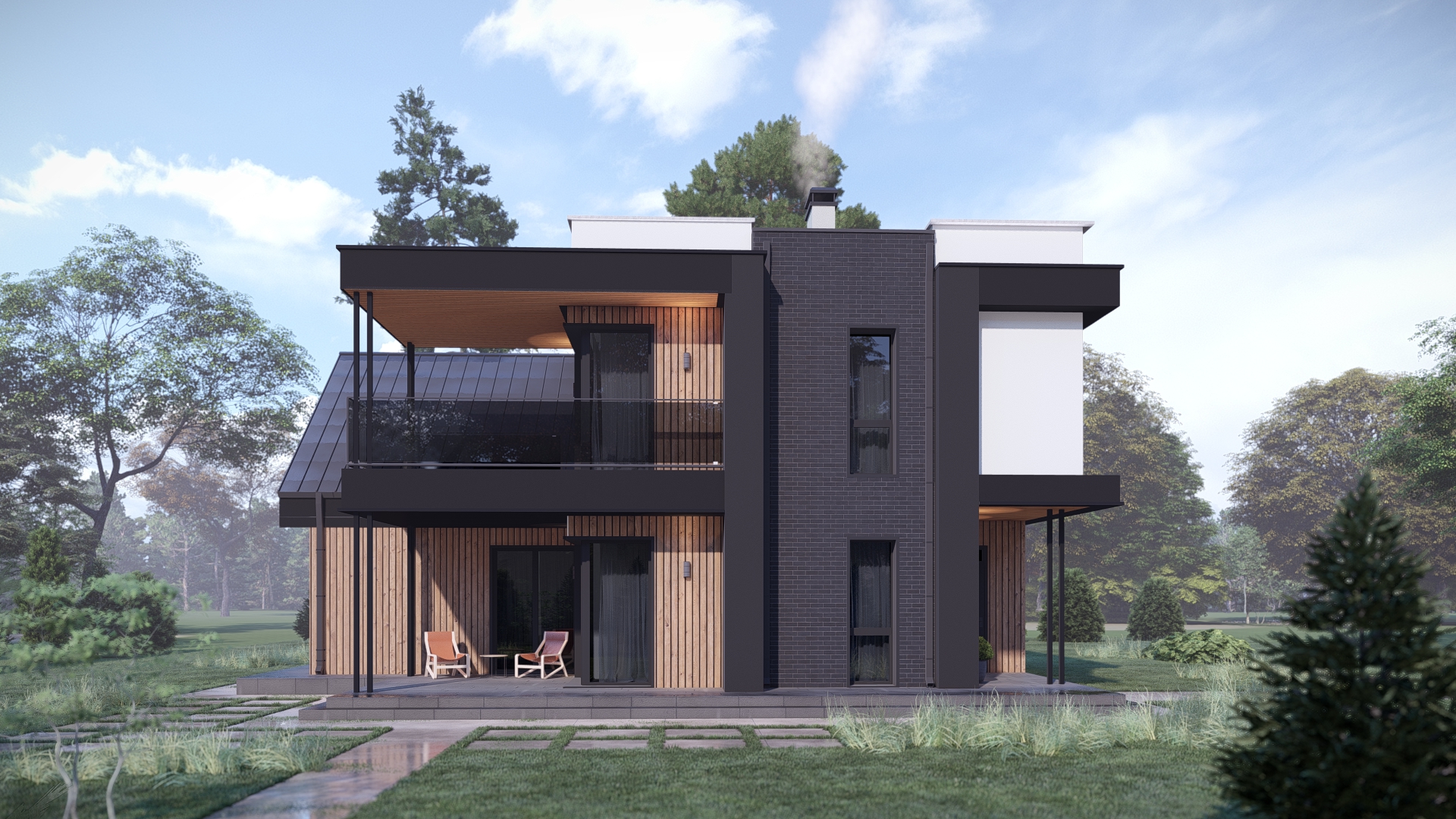 Фасадное решение сочетает штукатурку и облицовочный кирпич со вставками из планкена.