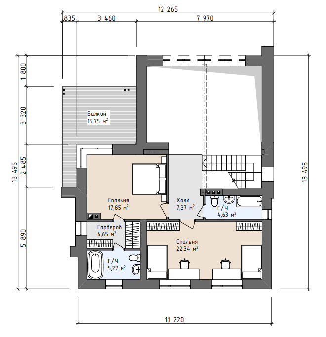Помещения 2-го этажа: холл, 2 С/У, 2 спальни, гардероб.