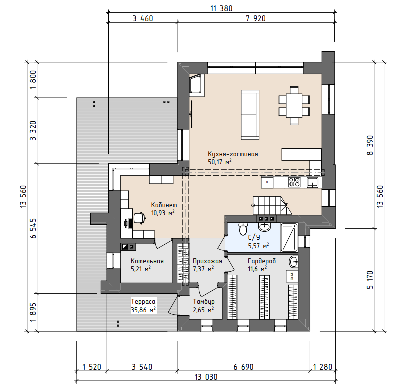 Помещения 1-го этажа: тамбур, холл, кухня-гостиная, котельная, С/У, гардероб, кабинет.