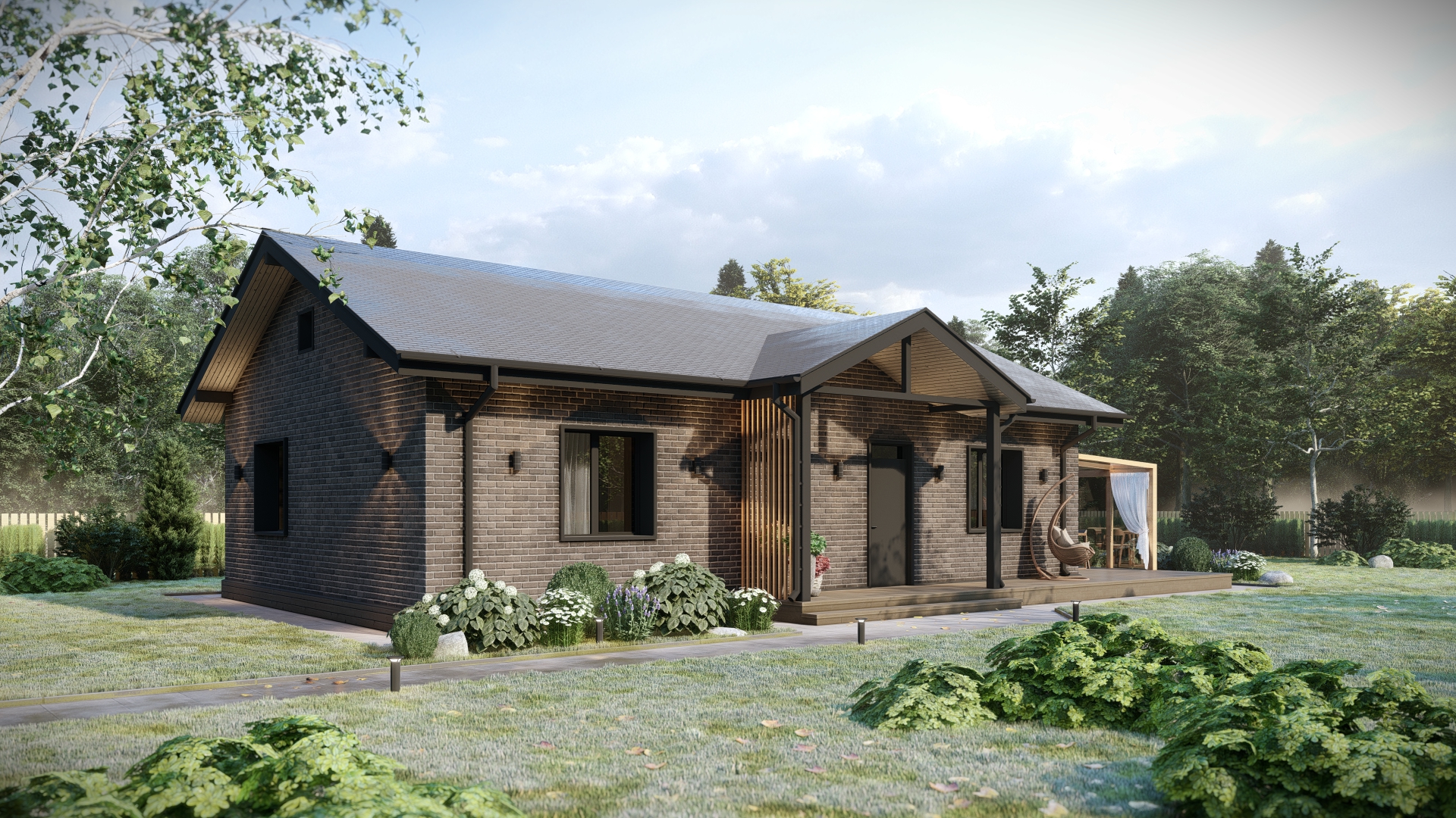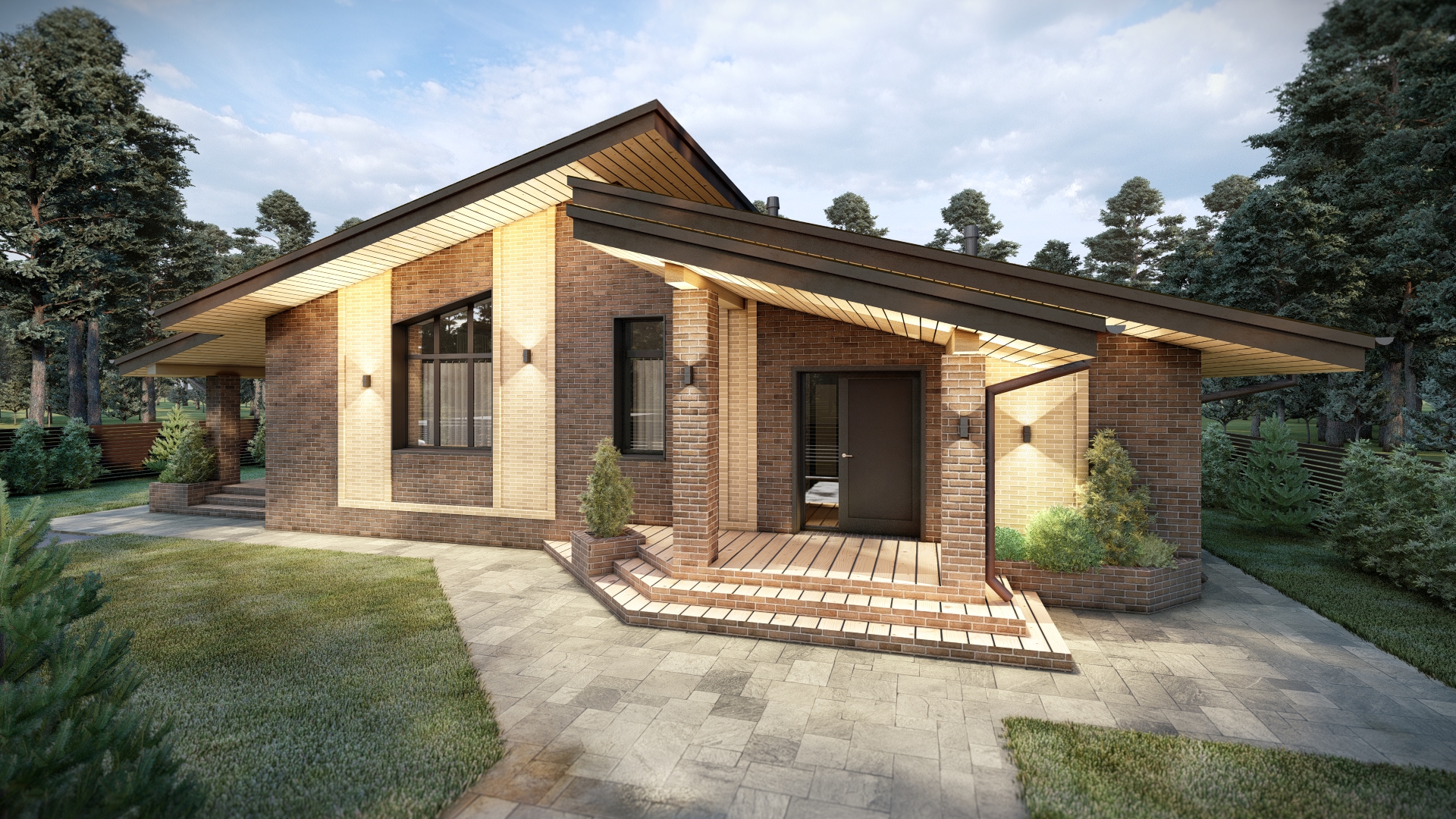 Одноэтажный индивидуальный жилой дом из кирпича в стиле шале Отделка фасада: облицовочный кирпич 2х оттенков, коричневый и...