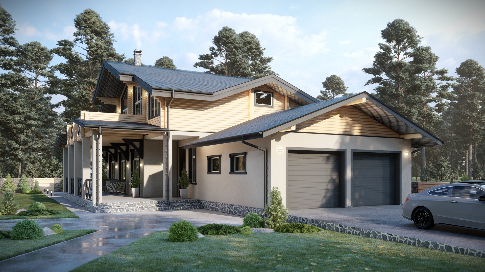 Комбинированный 2х этажный индивидуальный жилой дом с гаражом на 2 машины из кирпича и профилированного бруса. Отделка фасада: 1 этаж...