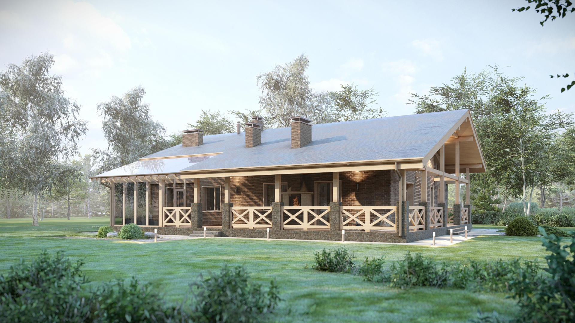 Одноэтажный дом из кирпича. Выполнен в стиле шале. Фасадное решение сочетает штукатурку и облицовочный кирпич. Помещения дома:...