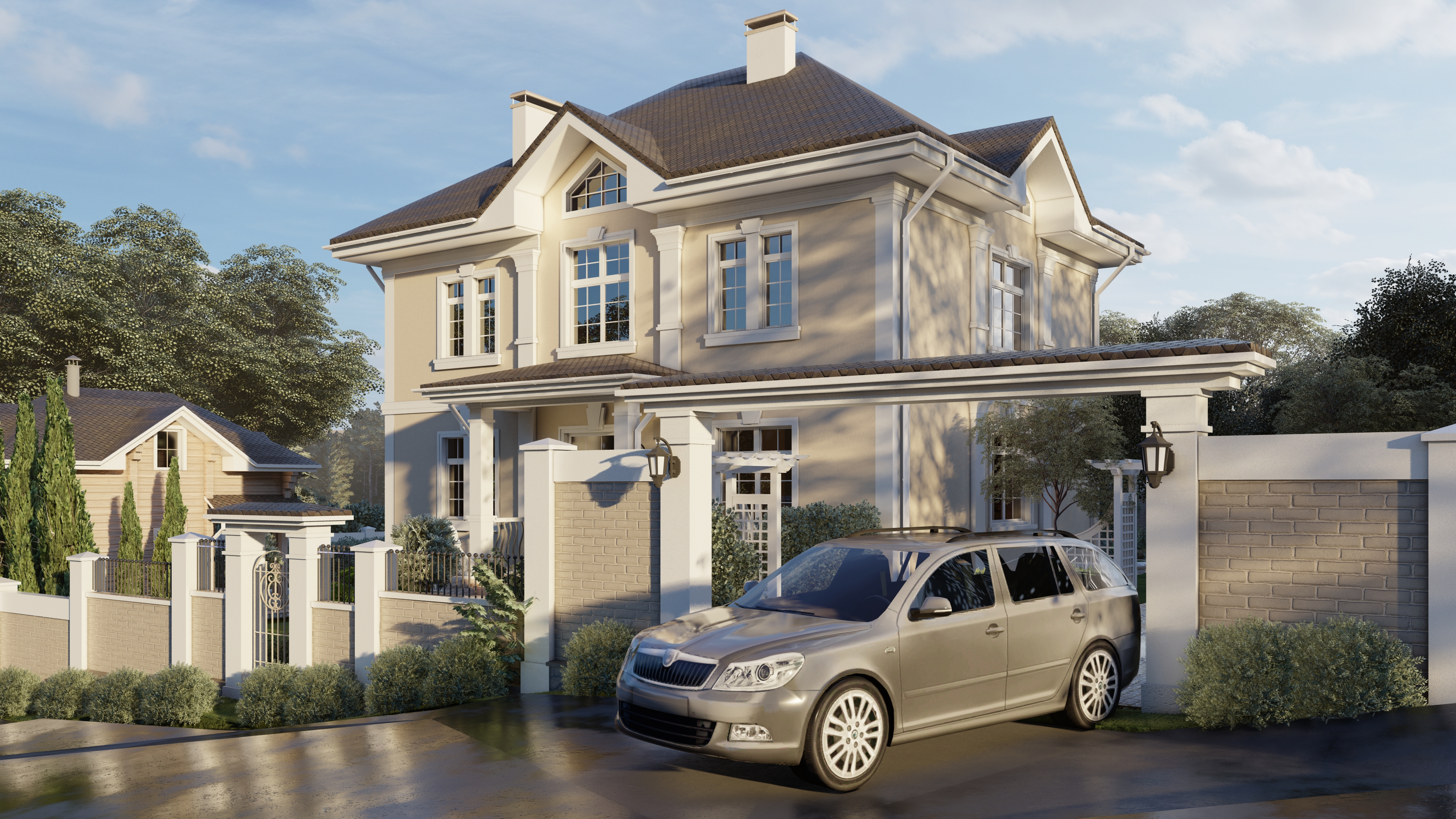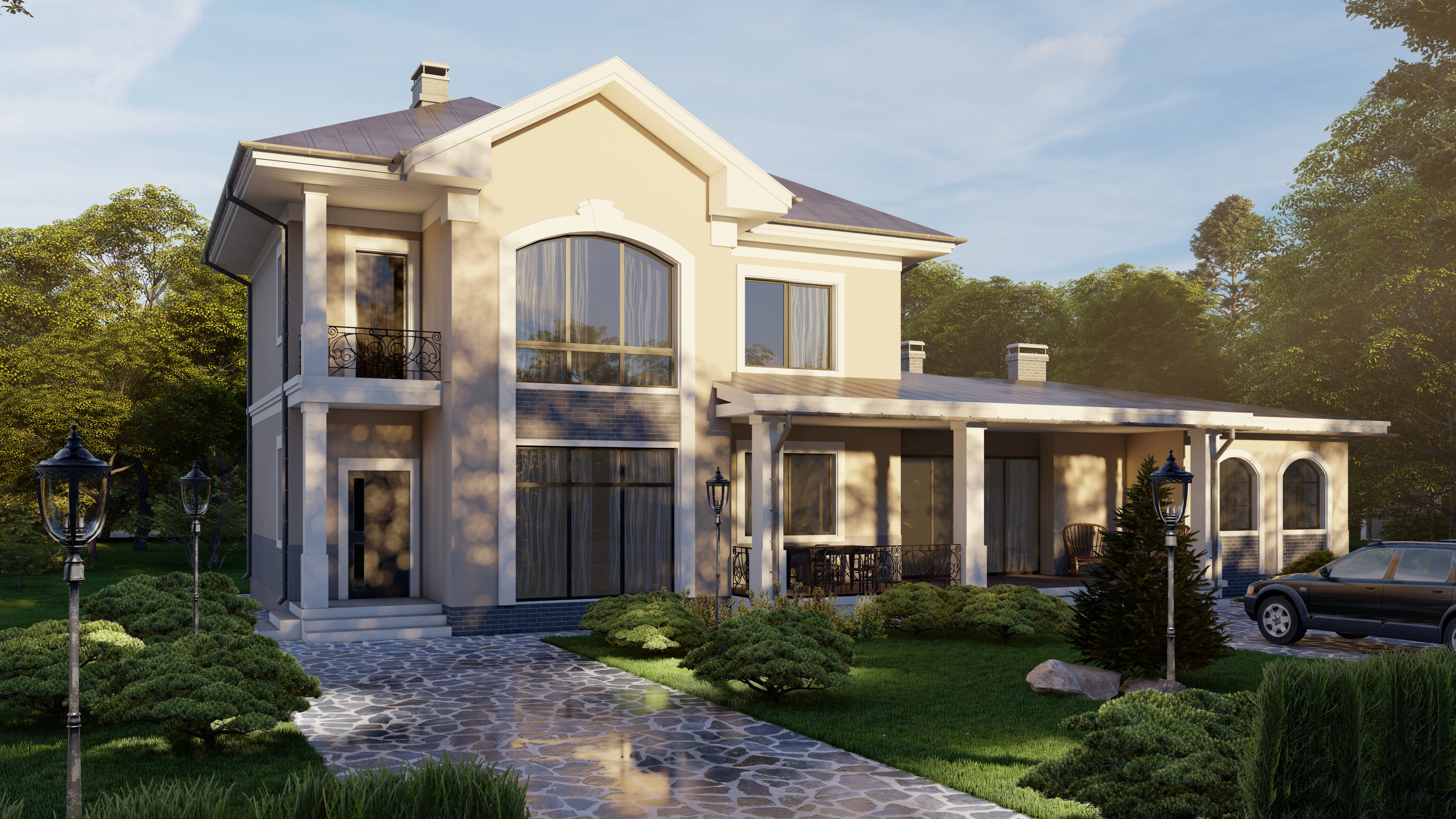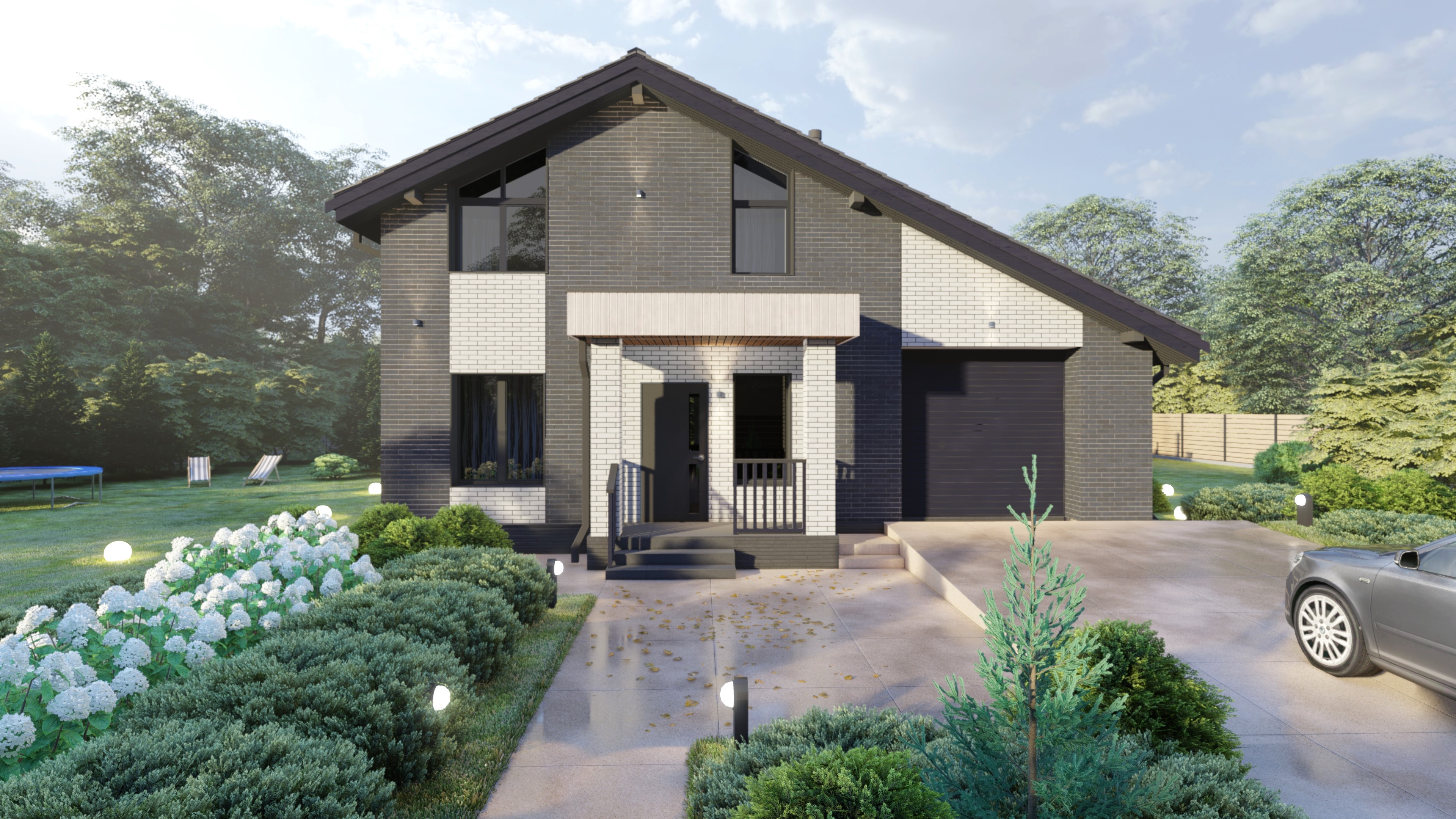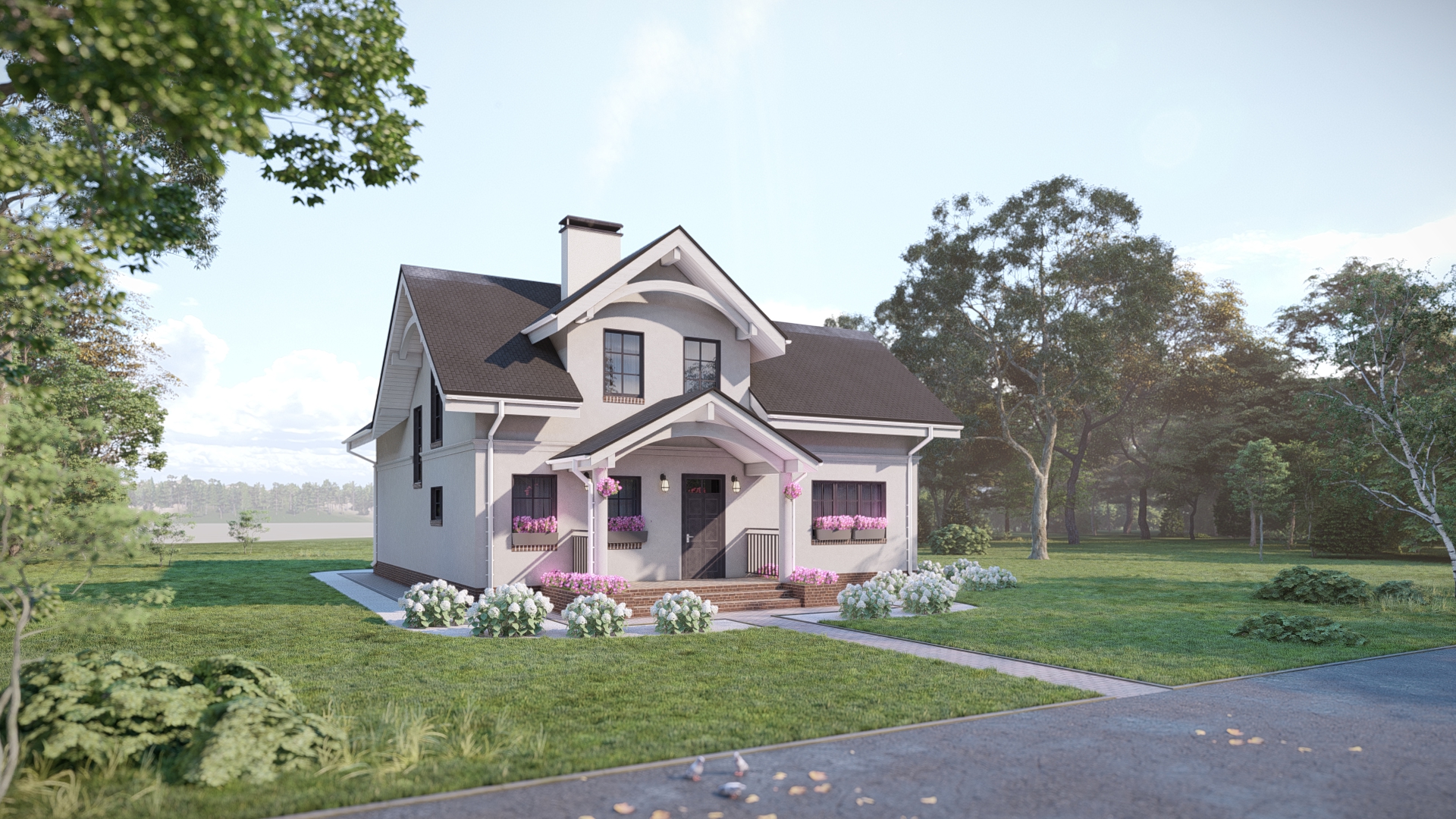Одноэтажный дом из кирпича с мансардой. Выполнен в стиле американской классики. На фасаде преобладает текстура штукатурки белого цвета...